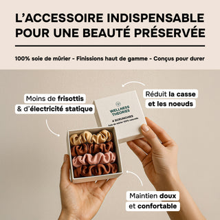 BOX DE 4 SCRUNCHIES EN SOIE DE MÛRIER 22MM – 100% Naturelle – Chouchous Doux pour les Cheveux – Anti-Casse, Anti-Frisottis, Préserve l’Hydratation – Élégance & Confort Quotidien