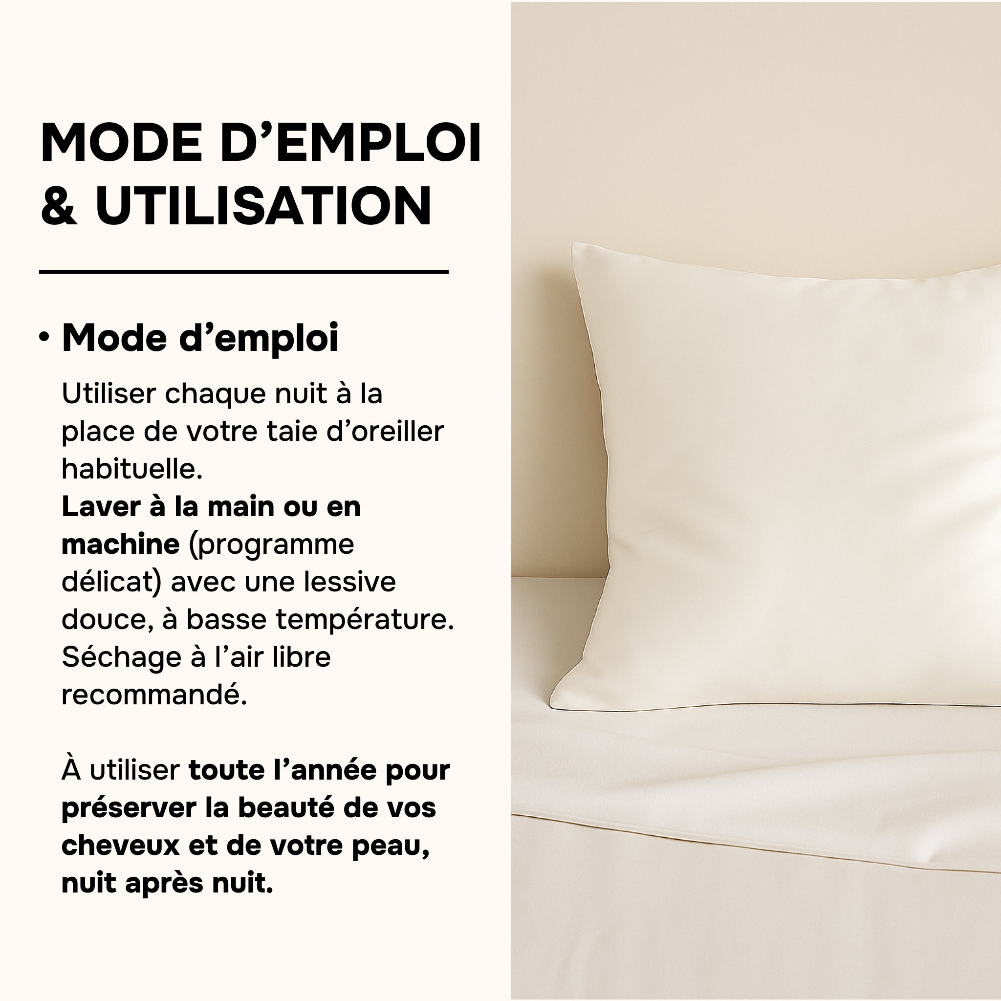 Utiliser chaque nuit comme une taie d’oreiller classique. Pour profiter pleinement de ses bienfaits sur la peau et les cheveux, privilégier un entretien régulier et doux.