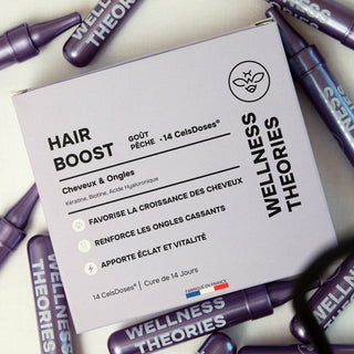 - Étape 3 – 28 jours : Terminez avec la cure HAIR BOOST – 28 CelsDose®, un shot par jour pendant 4 semaines pour un apport intensif en nutriments essentiels et une action revitalisante en profondeur.