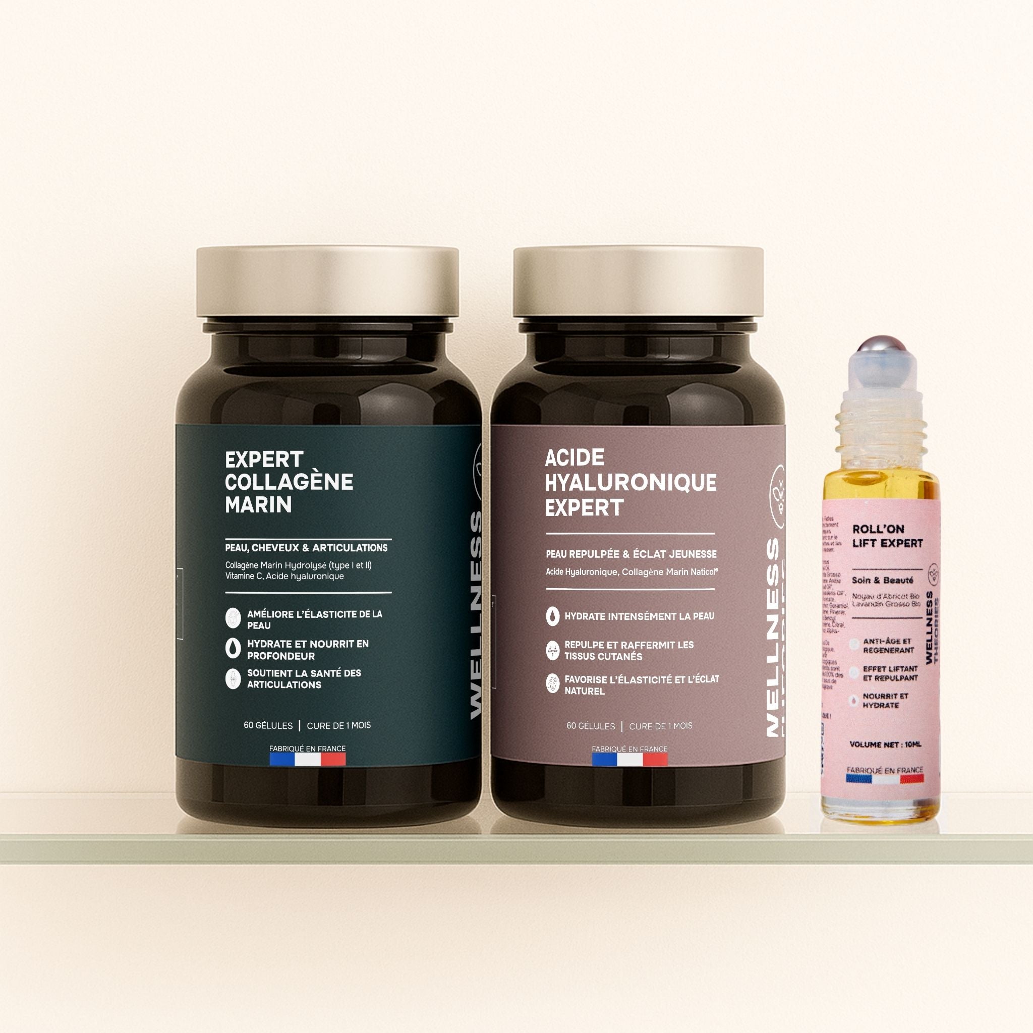 PACK ÉCLAT SUPRÊME – Cure Beauté Intégrale : Collagène + Acide Hyaluronique + Roll-On Lift – Peau Repulpée, Lisse et Éclatante – 2 Mois