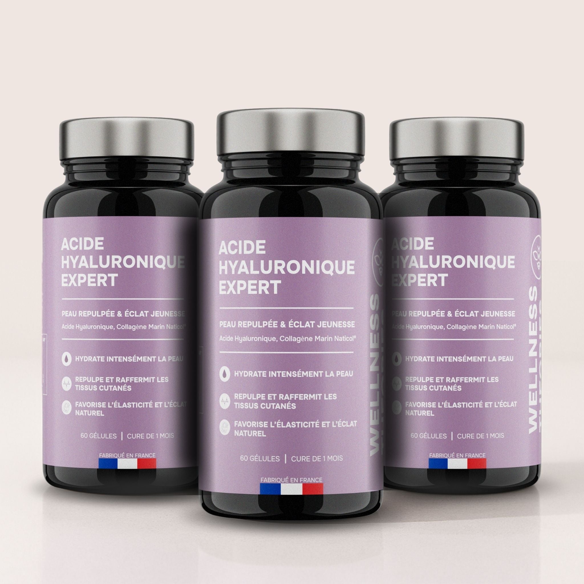 PACK X3 ACIDE HYALURONIQUE EXPERT – Avec Collagène Marin, Vitamines C & E – Hydratation Intense, Élasticité, Anti-Âge & Articulations – Formule Haute Absorption – 60 Gélules – Fabriqué en France