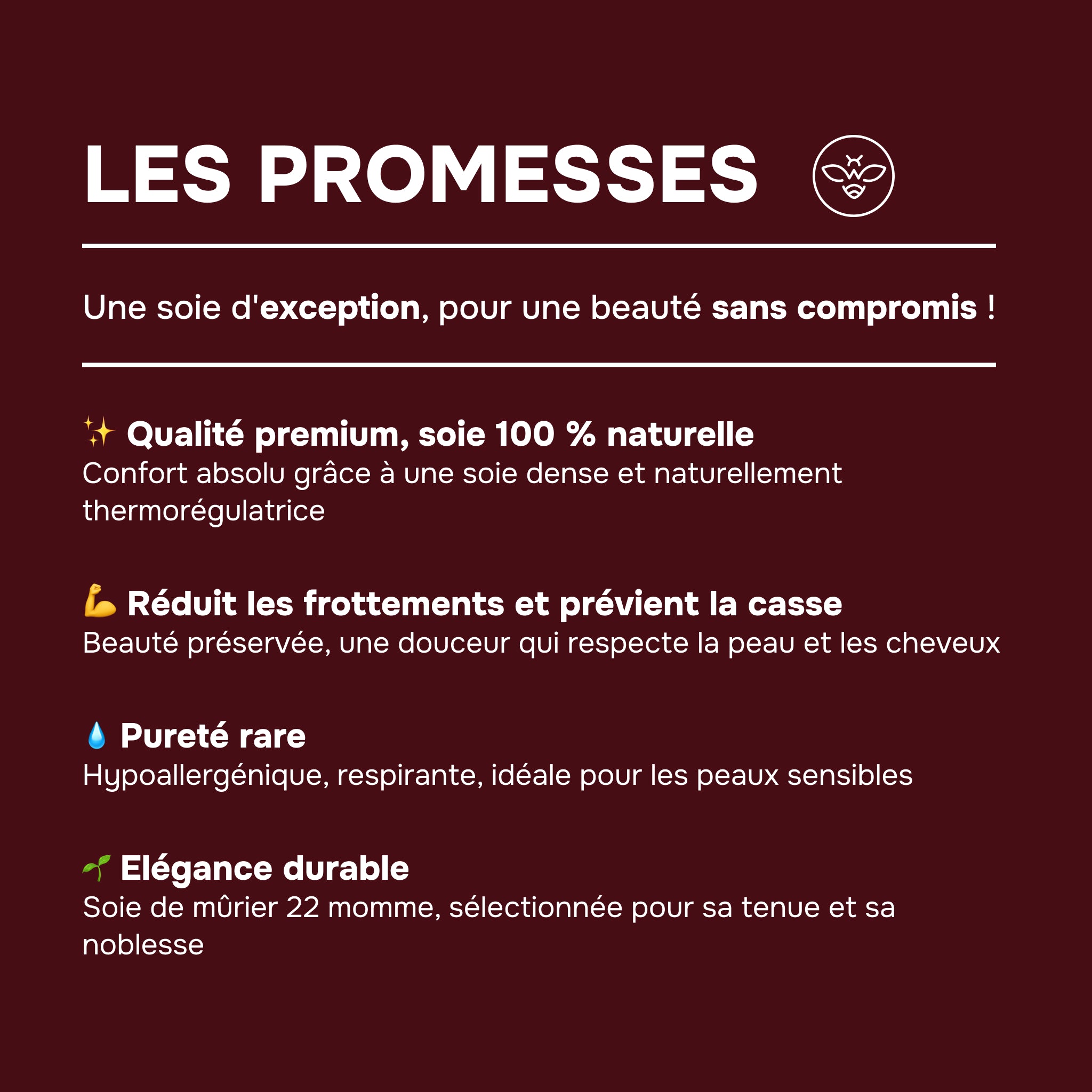 La soie de mûrier, naturellement hypoallergénique, thermorégulatrice et douce au toucher, respecte les peaux sensibles et les cheveux fragiles.