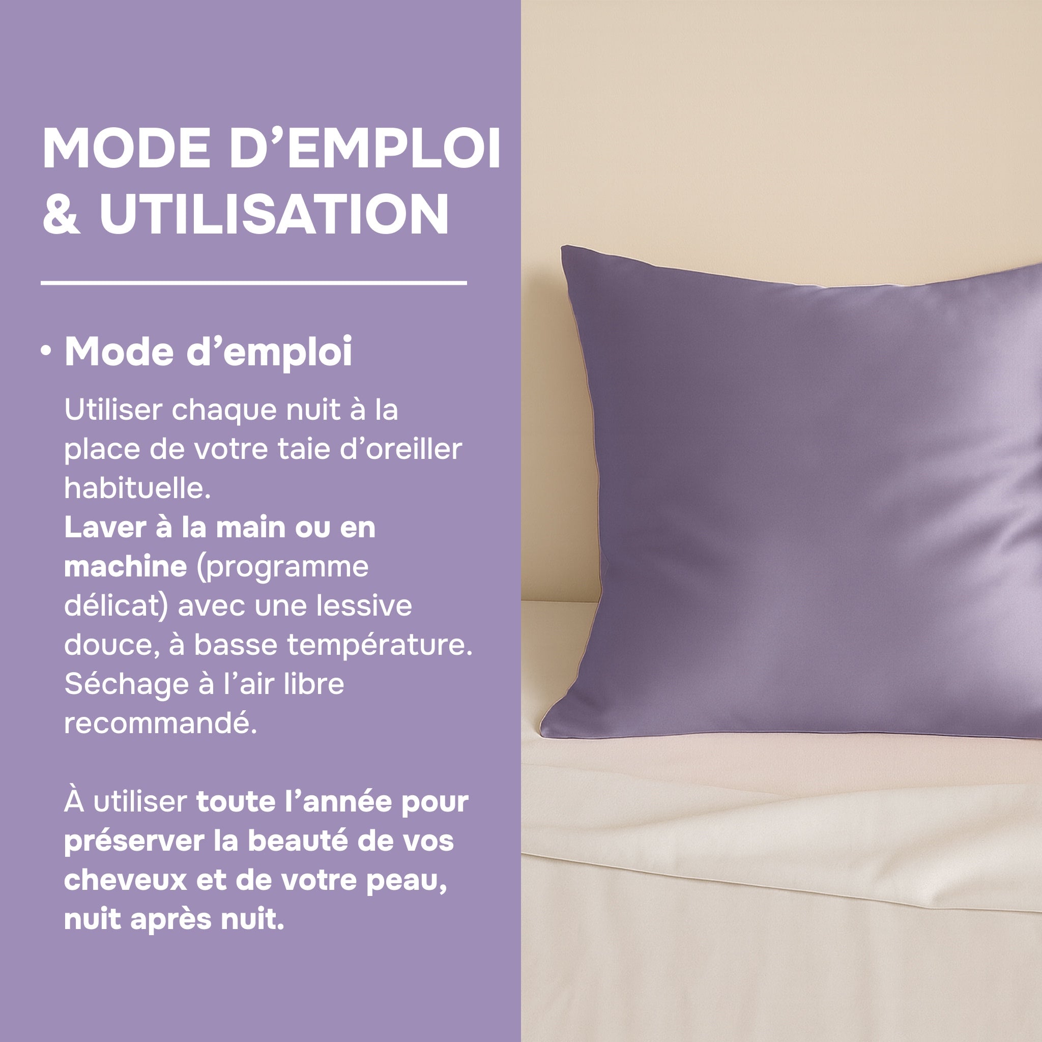 Jede Nacht wie einen herkömmlichen Kissenbezug verwenden. Um die Vorteile für Haut und Haare voll auszuschöpfen, ist eine regelmäßige und schonende Pflege empfehlenswert. Ideal für empfindliche Haut, kann er das ganze Jahr über verwendet werden und sorgt für optimalen Komfort und ein natürlich frisches Gefühl.