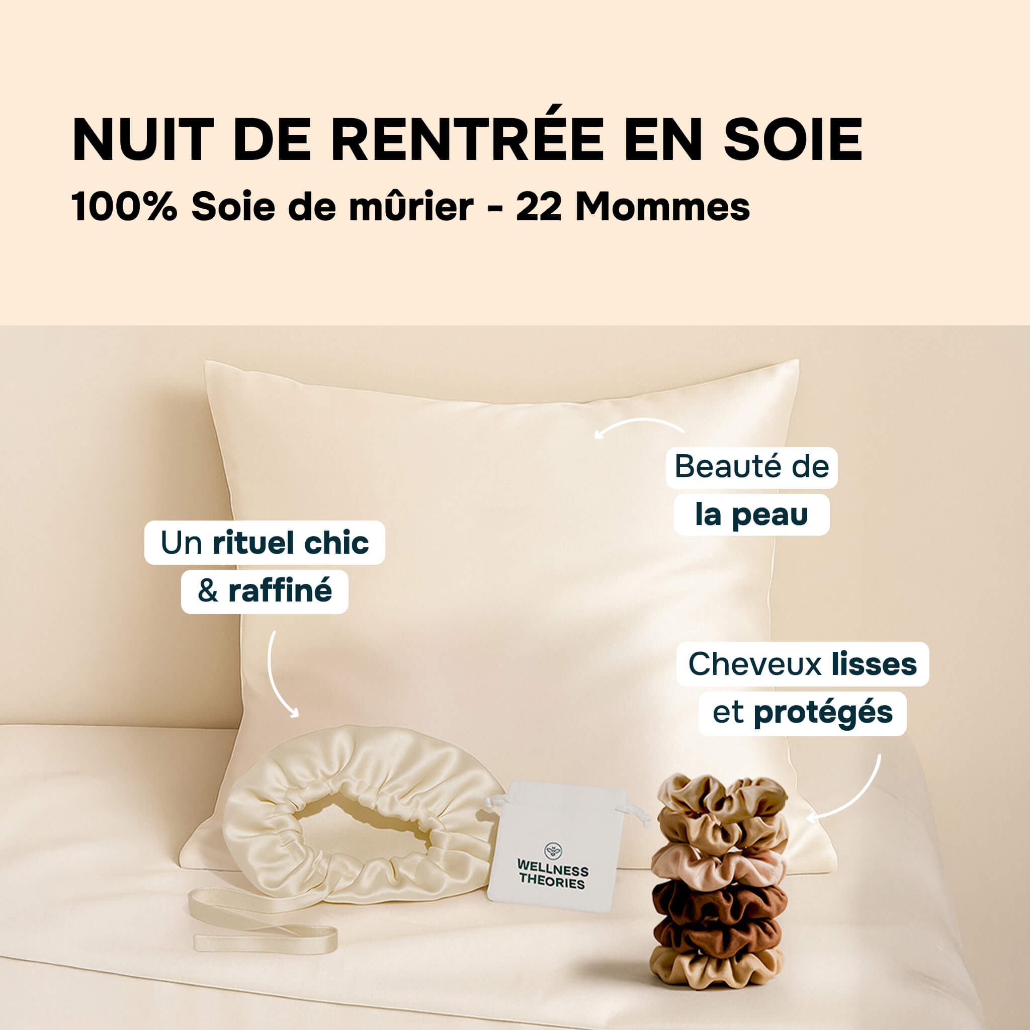Das Set "Nuit de Rentrée en Soie" ist ein hochwertiges Schönheits- und Komfortritual, das die Haut verschönert, das Haar schützt und Ihren Nächten einen Hauch von Eleganz verleiht. Dank der 22 mm Naturseide, die für ihre Weichheit und ihre einzigartigen Eigenschaften bekannt ist, wirkt jedes Accessoire synergetisch, um Ihre Nächte in eine wahre Schönheitspflege zu verwandeln.
