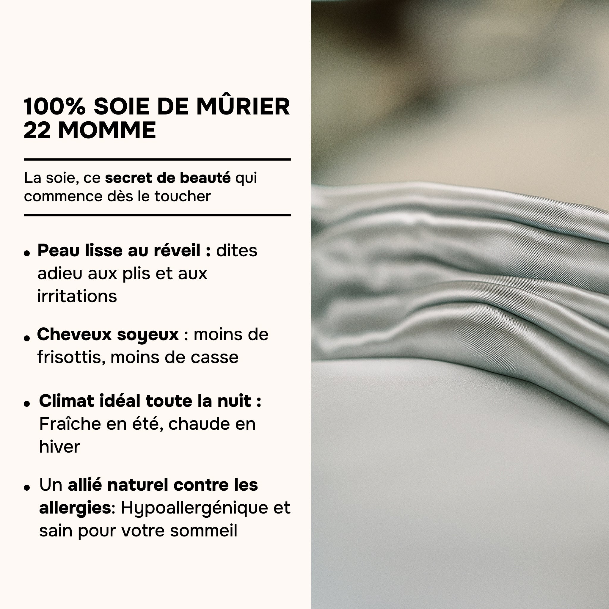 Maulbeerseide ist von Natur aus hypoallergen, temperaturausgleichend und unglaublich weich. Sie respektiert empfindliche Haut und schützt empfindliches Haar.