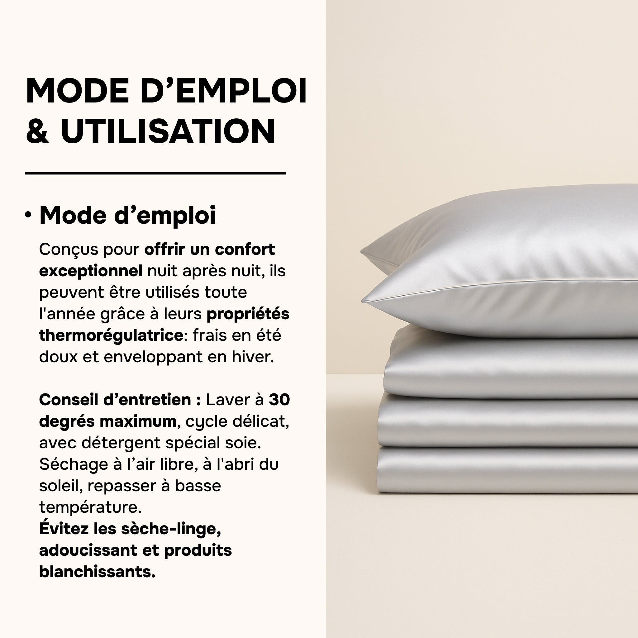 Im Gegensatz zu Baumwolle nimmt sie die vor dem Schlafengehen aufgetragene Pflege nicht auf und bewahrt das natürliche Gleichgewicht der Haut und der Haarfaser.