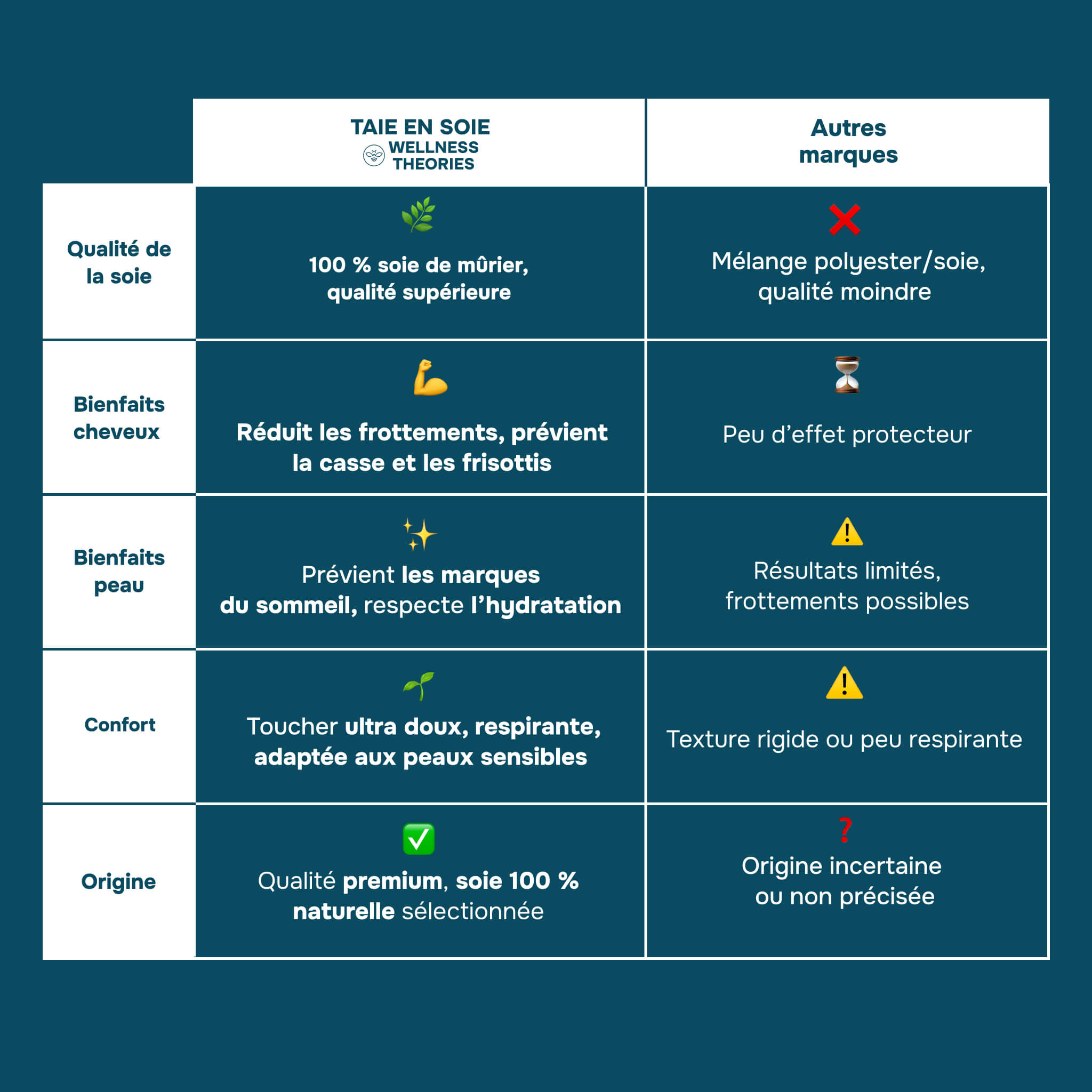 Dieser luxuriöse Bezug besteht zu 100 % aus Maulbeerseide, ist weich, hypoallergen und von Natur aus temperaturregulierend. Im Gegensatz zu Baumwolle nimmt er abends aufgetragene Pflegeprodukte nicht auf und respektiert das Hautgleichgewicht. Er trägt dazu bei, die Haut glatt zu halten, die Bildung feiner Linien zu reduzieren und das Haar glänzend und gepflegt aussehen zu lassen. Ein unverzichtbares Beauty-Essential für die nächtliche Routine.
