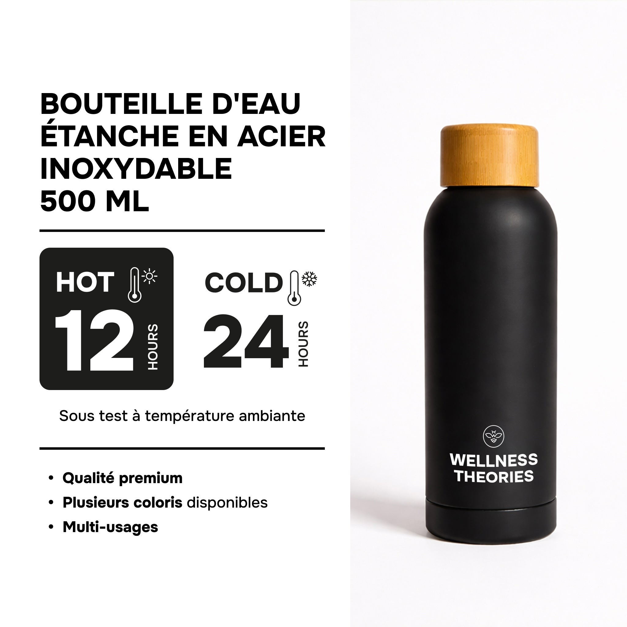 WELLNESS THEORIES – Isolierflasche, auslaufsicher, 500 ml – Edelstahl & Bambus – Schwarz