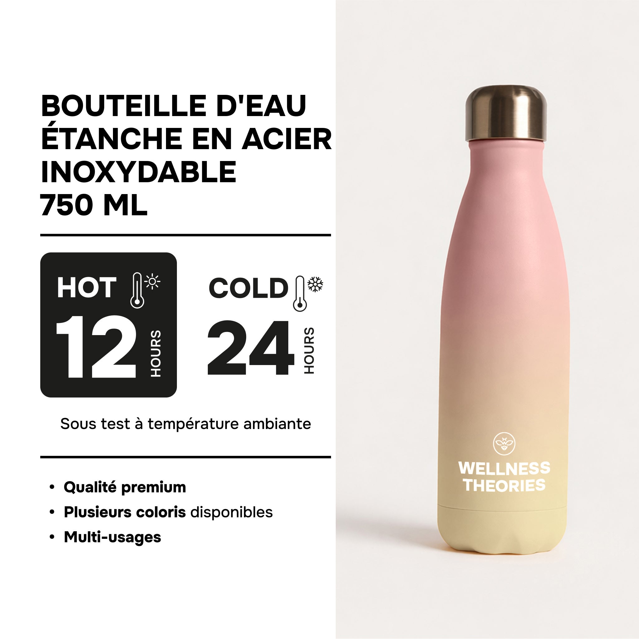 Stay hydrated in style with the Wellness Theories 750 ml insulated bottle, with an elegant gradient design and optimal thermal performance.
