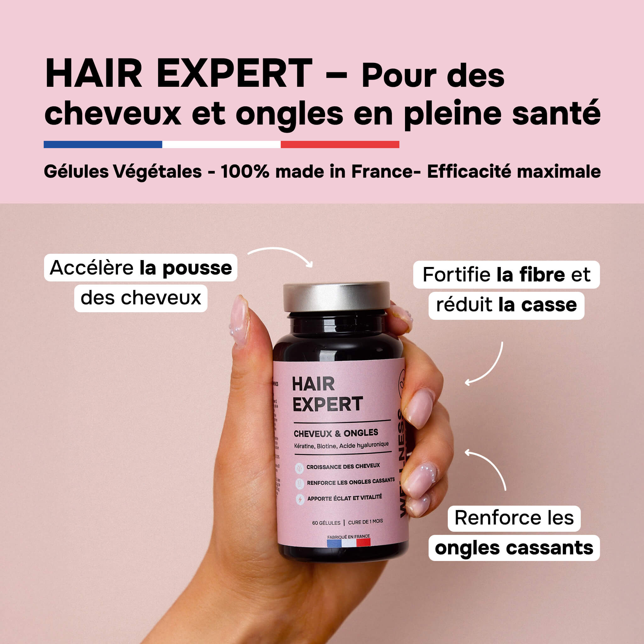 HAIR EXPERT Pack of 3 – Hair Growth, Strength & Shine – Keratin, Biotin, Zinc, Hyaluronic Acid & Vitamins – 3-Month Treatment – Made in France