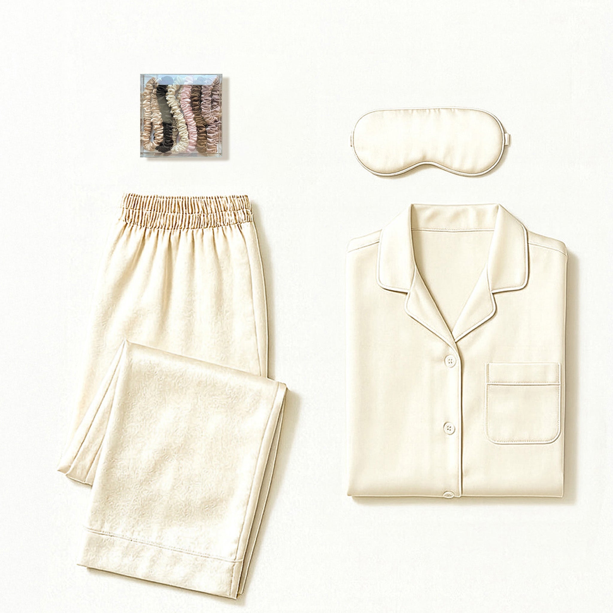 CHAMPAGNE SILK SLEEPING SET – PYJAMAS, SLEEPING MASK & BOX OF 6 SILK SCRUNCHIES – COMFORT, BEAUTY & RESTORATIVE SLEEP