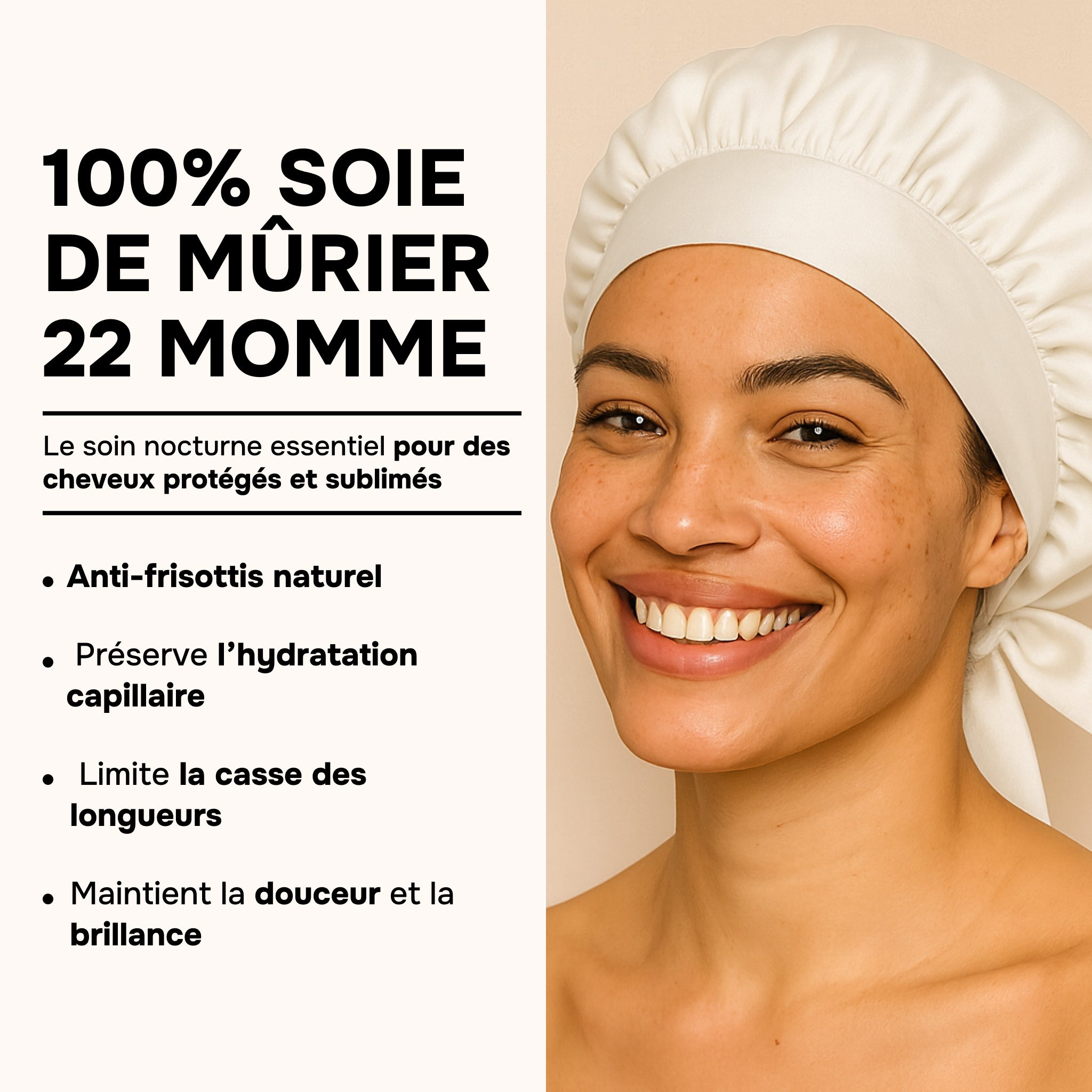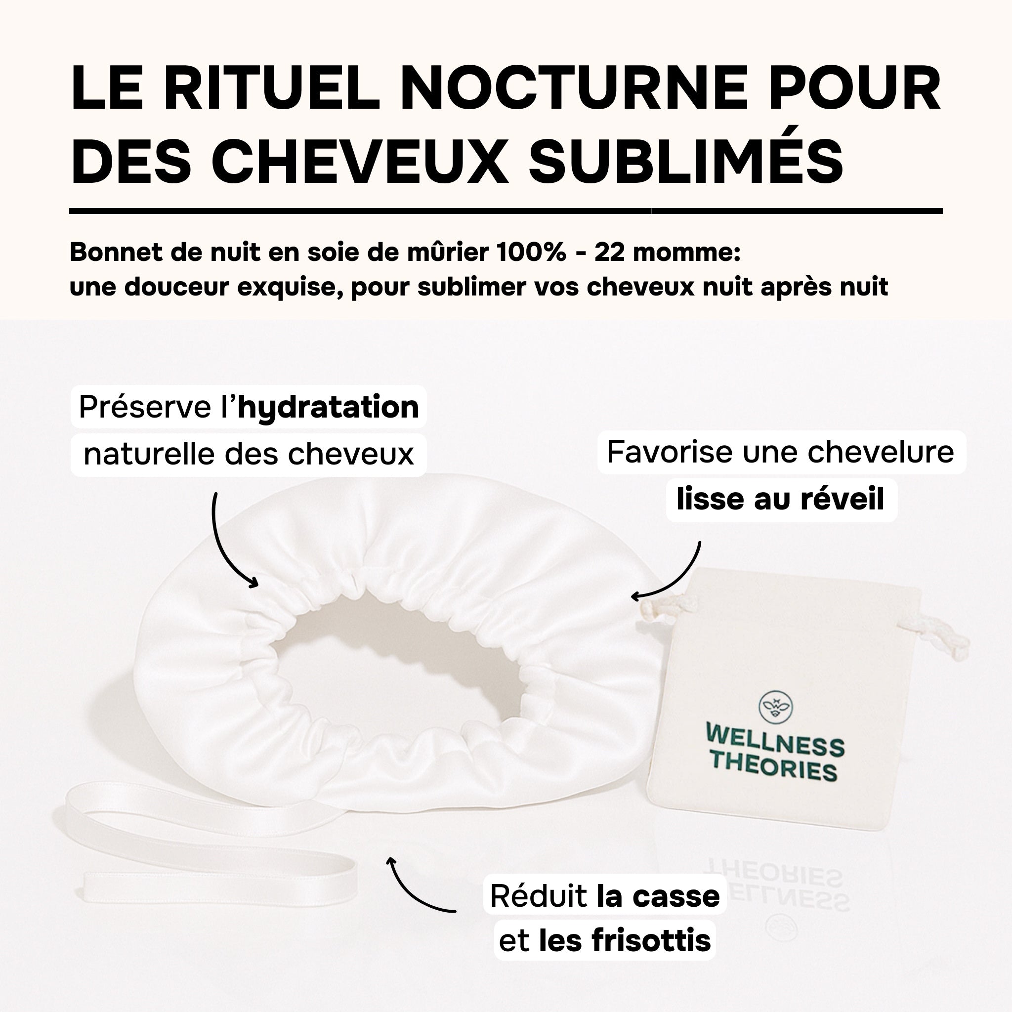 Thanks to the silk pillowcase, the skin retains its moisture and remains smooth when you wake up; the cap protects the length and preserves the shine of the hair; and the scrunchies allow you to tie your hair back without damaging it, while adding a touch of elegance.
