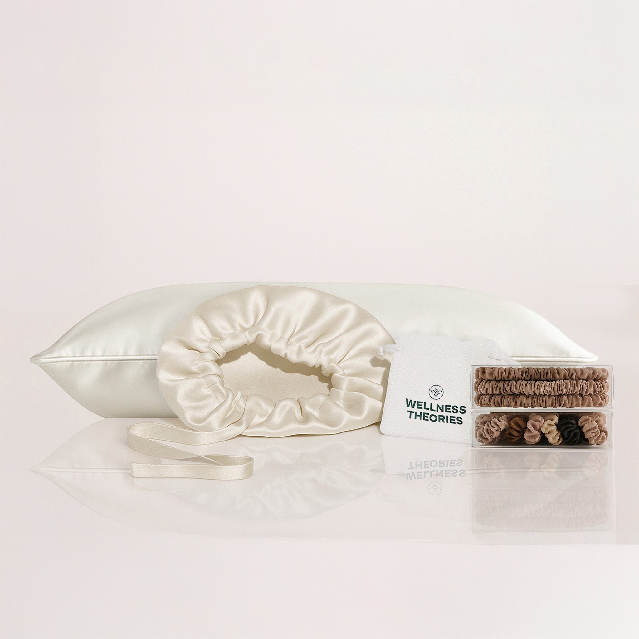 IVORY SILK BEAUTY RITUAL – PILLOWCASE, BONNET & SCRUNCHIES – SOFTNESS, RADIANCE & NATURAL ELEGANCE