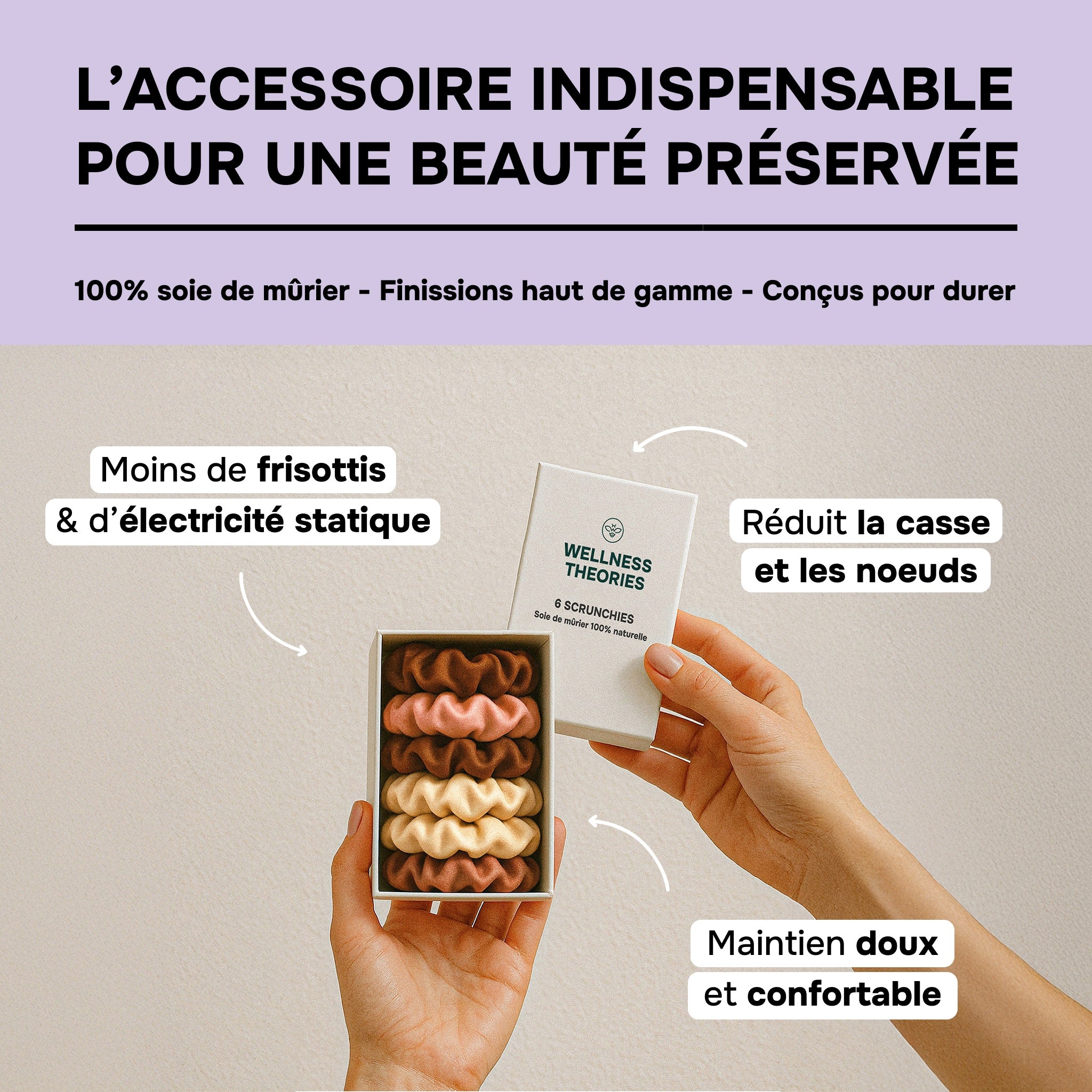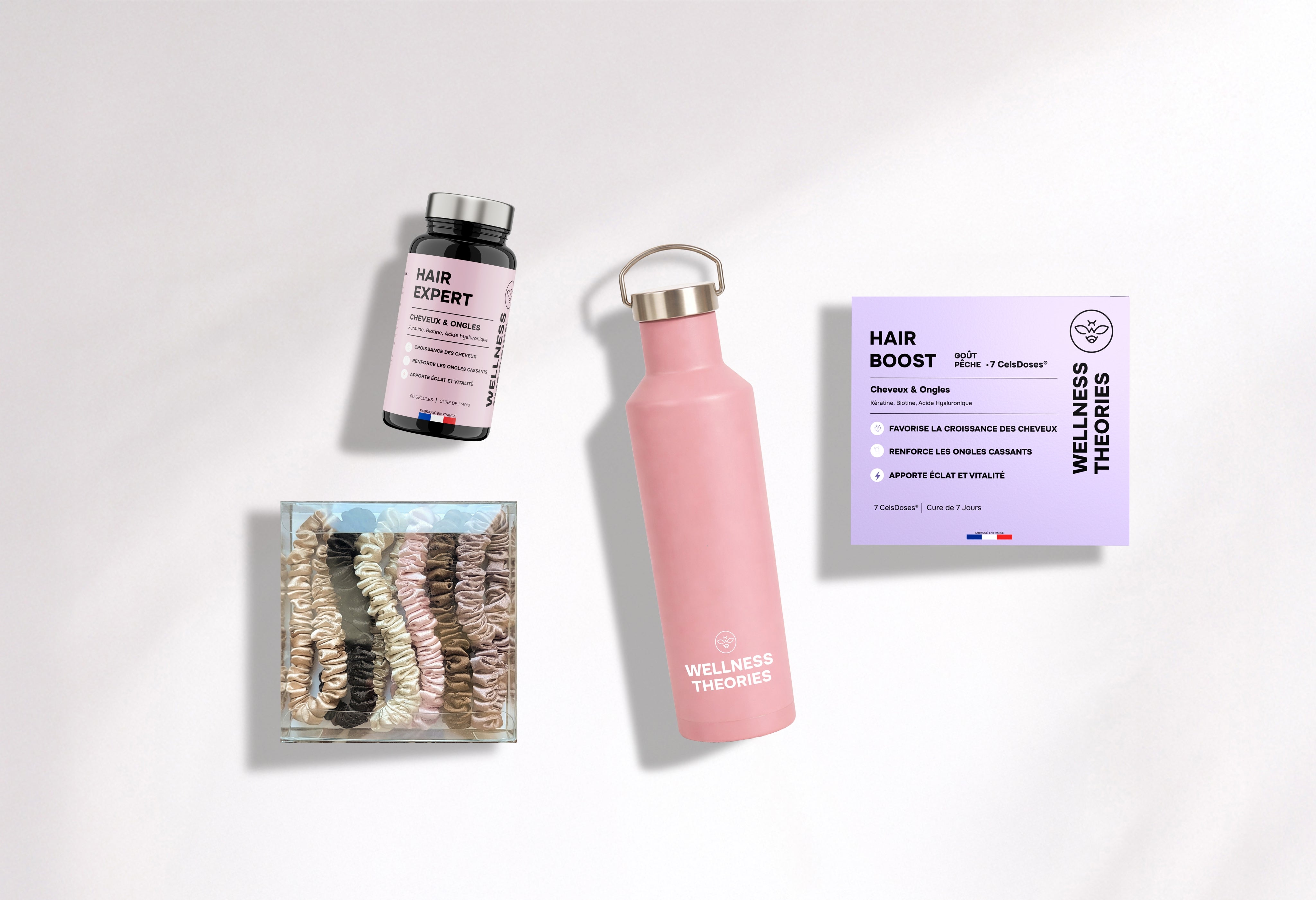 The essential routine for strong, shiny, and hydrated hair : Hair Boost capsules, silk accessories, and insulated water bottle.