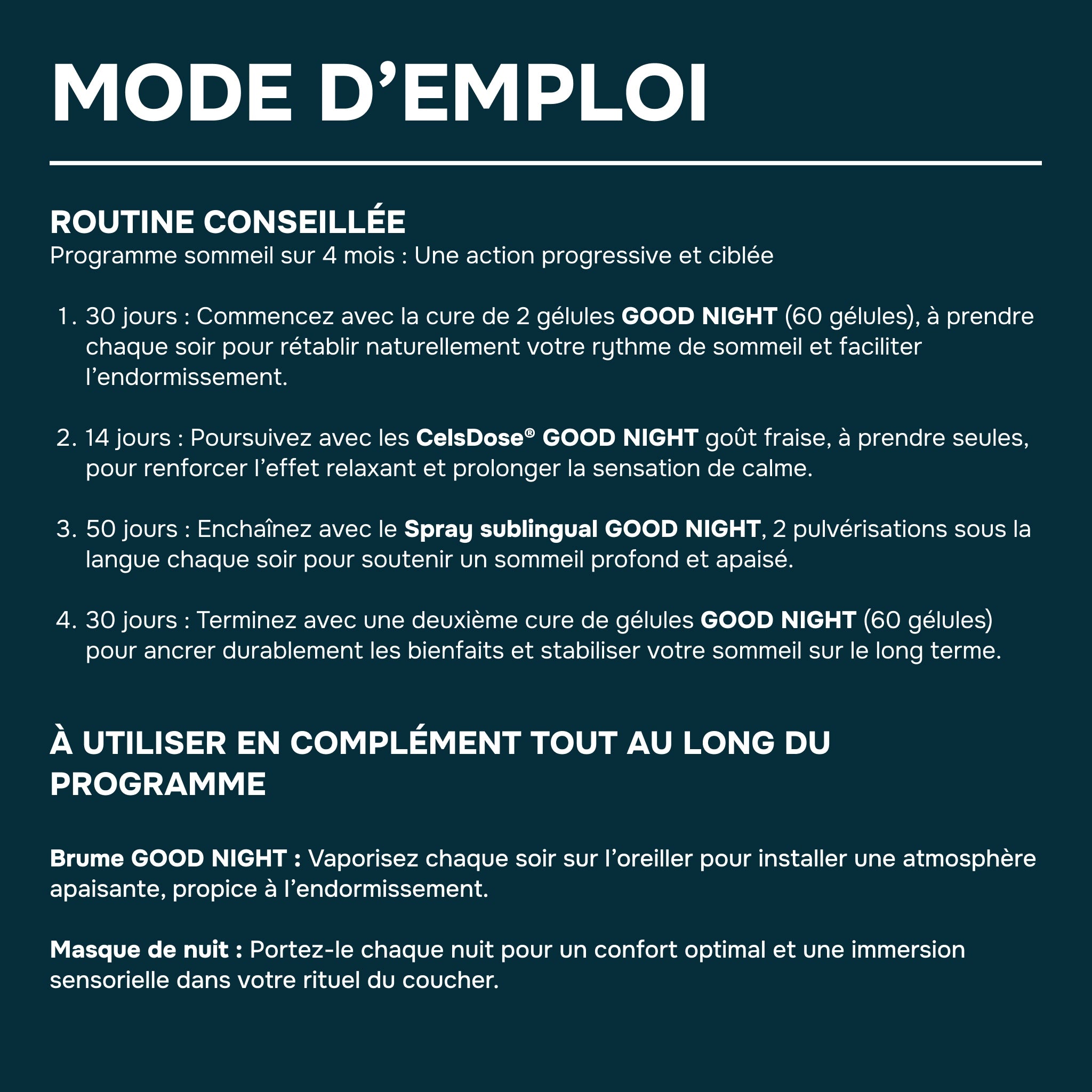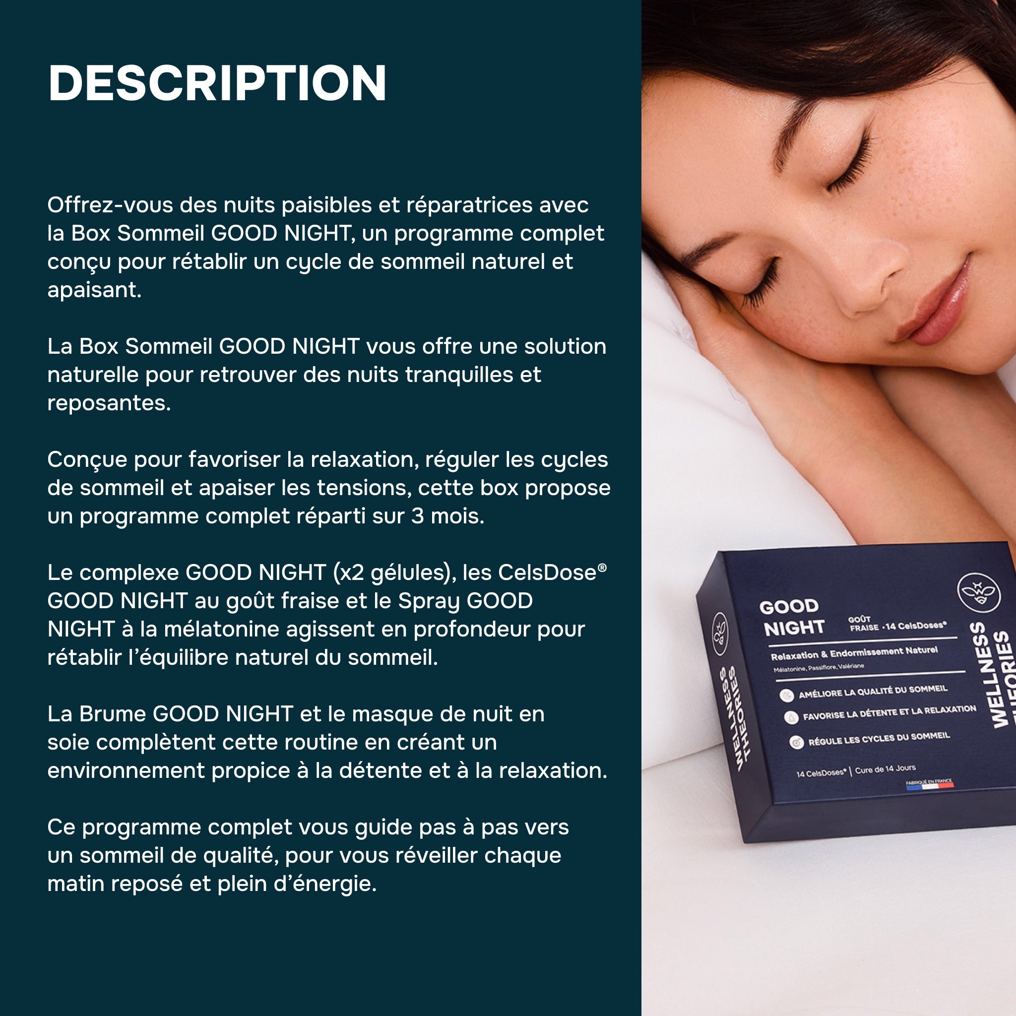 Who is it for? For those looking for a complete routine to restore deep, natural sleep, calm the mind, and wake up feeling rested, relaxed, and full of energy.
