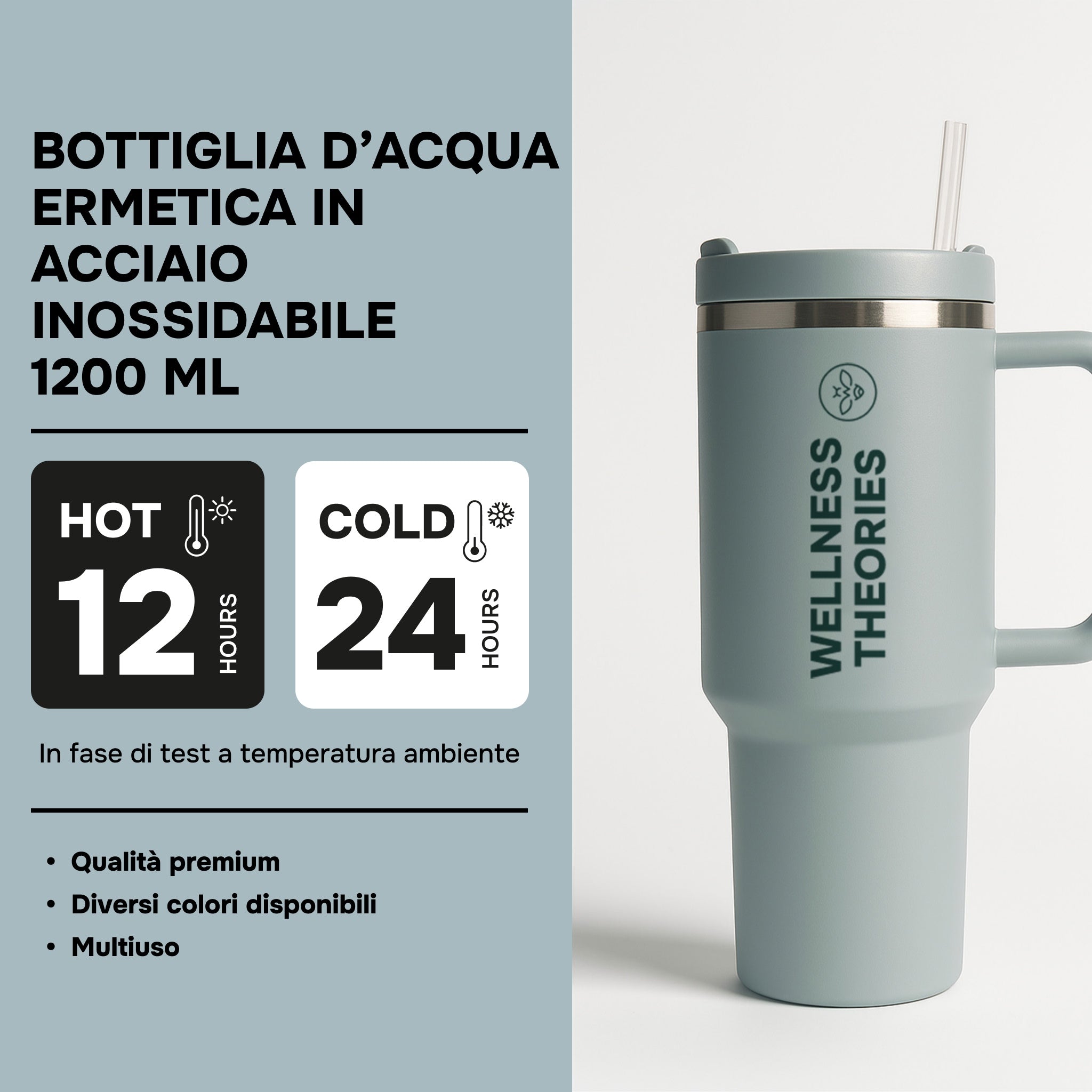 1200 ml stainless steel insulated bottle: Equipped with a built-in straw, waterproof, designed for hot and cold drinks, keeping drinks hot for up to 12 hours and cold for up to 24 hours.