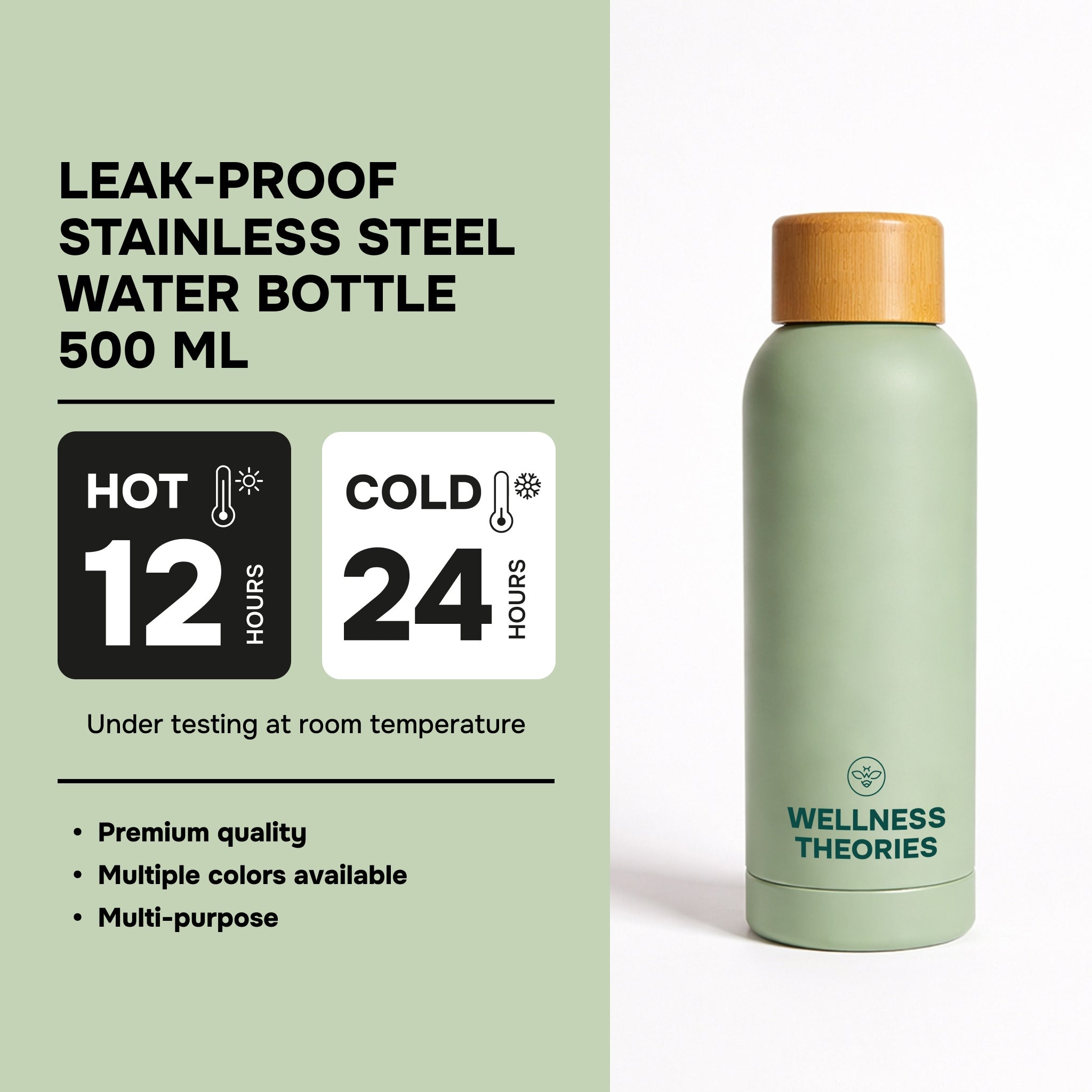 500 ml stainless steel insulated bottle with a white wood-finish cap featuring an airtight, leak-proof seal, capable of keeping drinks hot for up to 12 hours and cold for up to 24 hours.