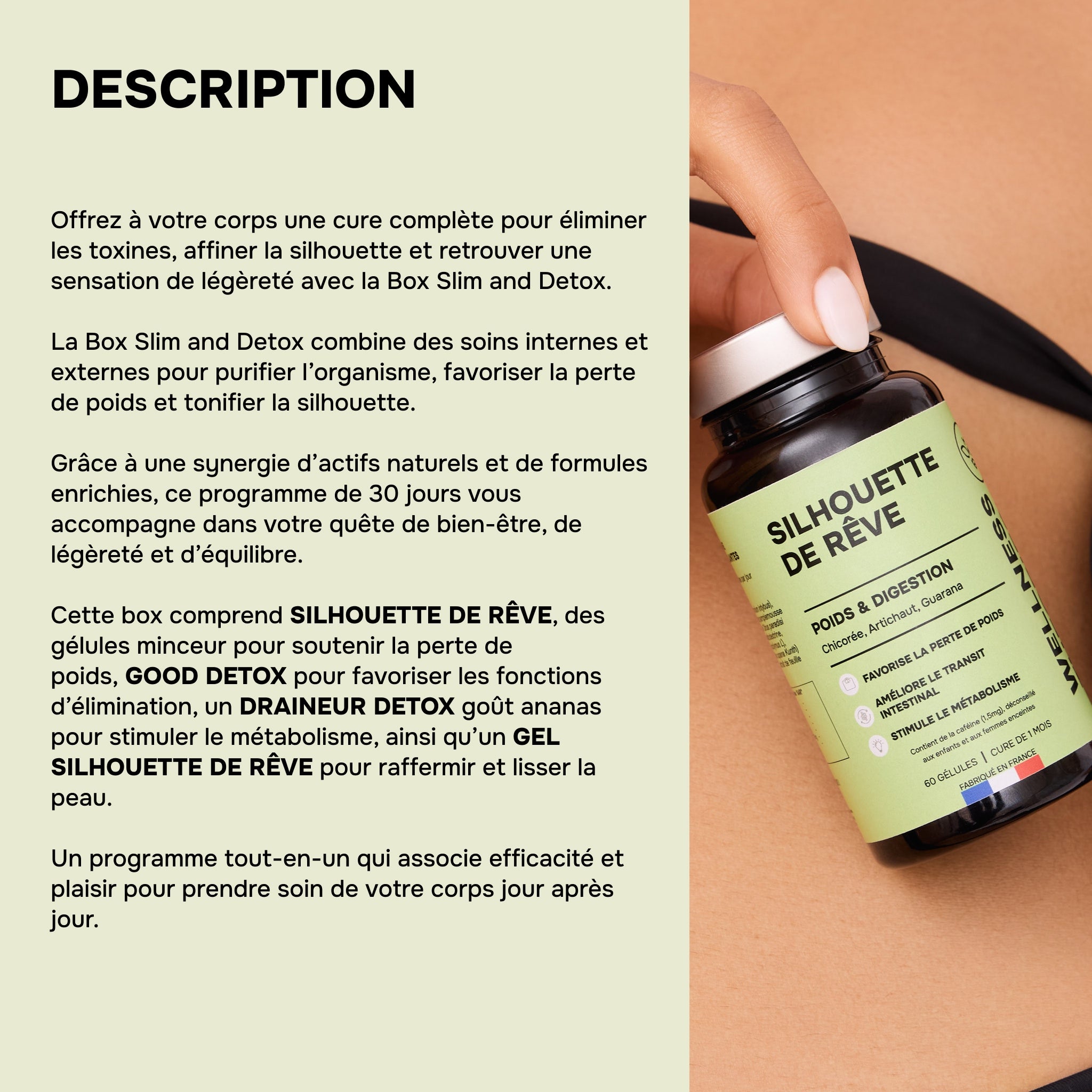 These slimming capsules combine active plant extracts to stimulate the metabolism, burn fat, and promote the elimination of toxins. Enriched with guarana, green tea, artichoke, and chicory inulin, they support digestion, reduce water retention, and have a detoxifying effect. Their natural formula helps refine the silhouette while maintaining energy balance.
