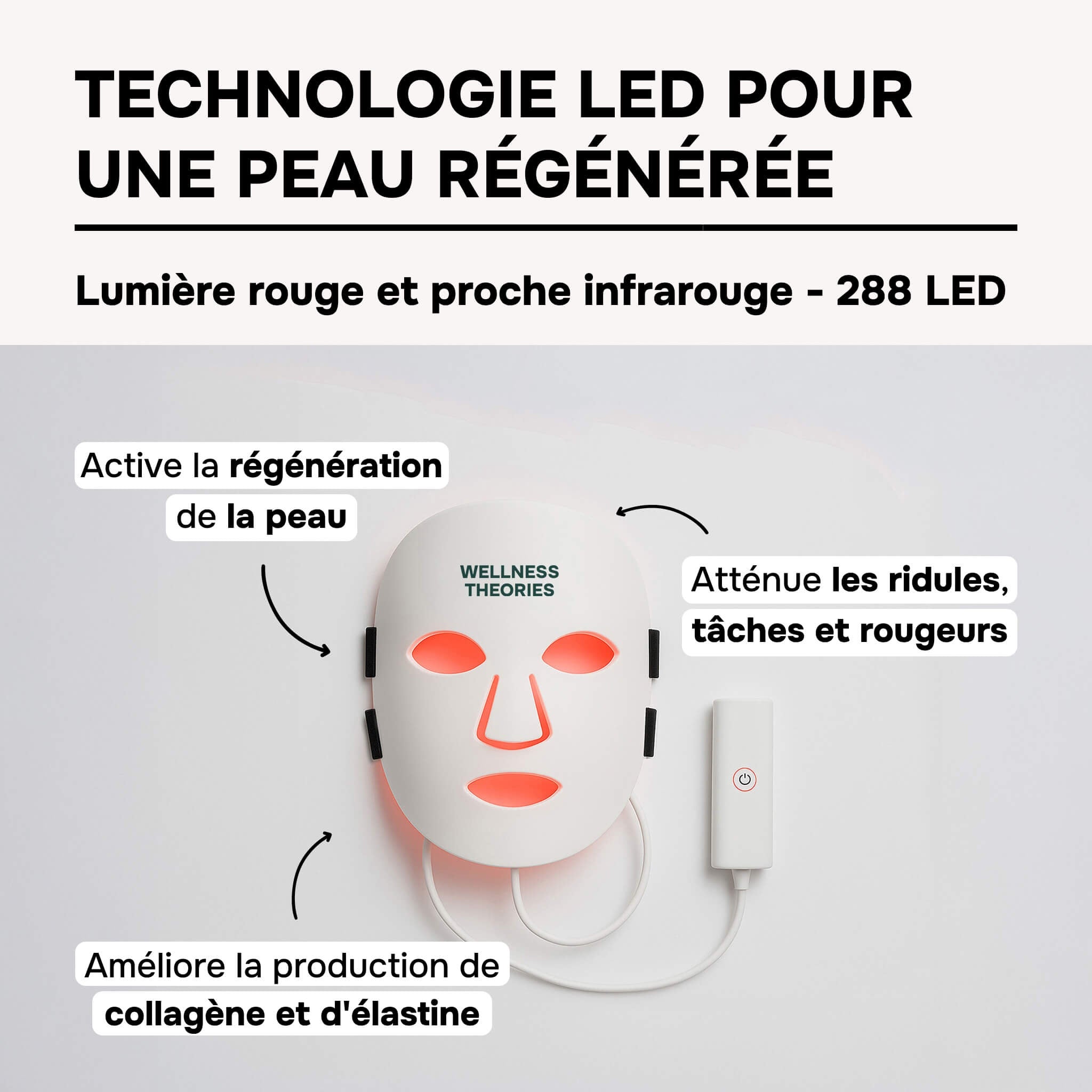 - Red LED (633 nm): stimulates collagen production, accelerates cell regeneration, and restores radiance to the complexion.