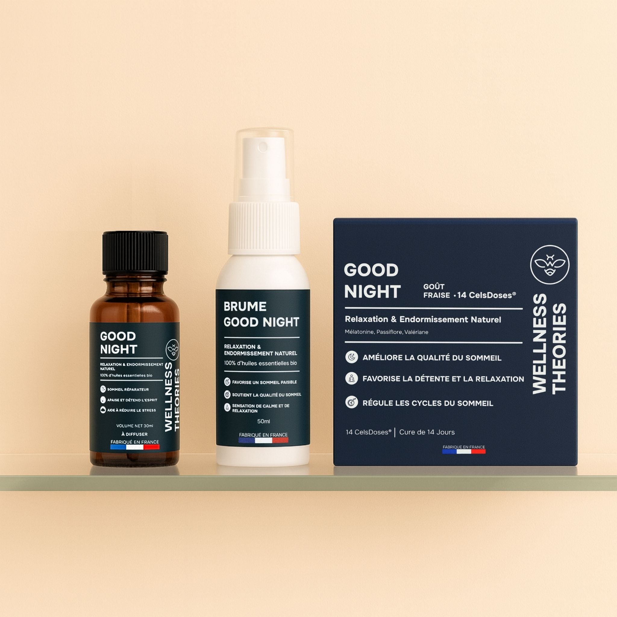 The GOOD NIGHT synergy combines organic essential oils of lavandin, sweet orange, chamomile, ylang-ylang, petitgrain bigarade, bergamot, marjoram, and lemongrass, known for their calming properties. Their floral, sweet, and enveloping aromas soothe the nervous system, release tension, and naturally prepare the body for rest.