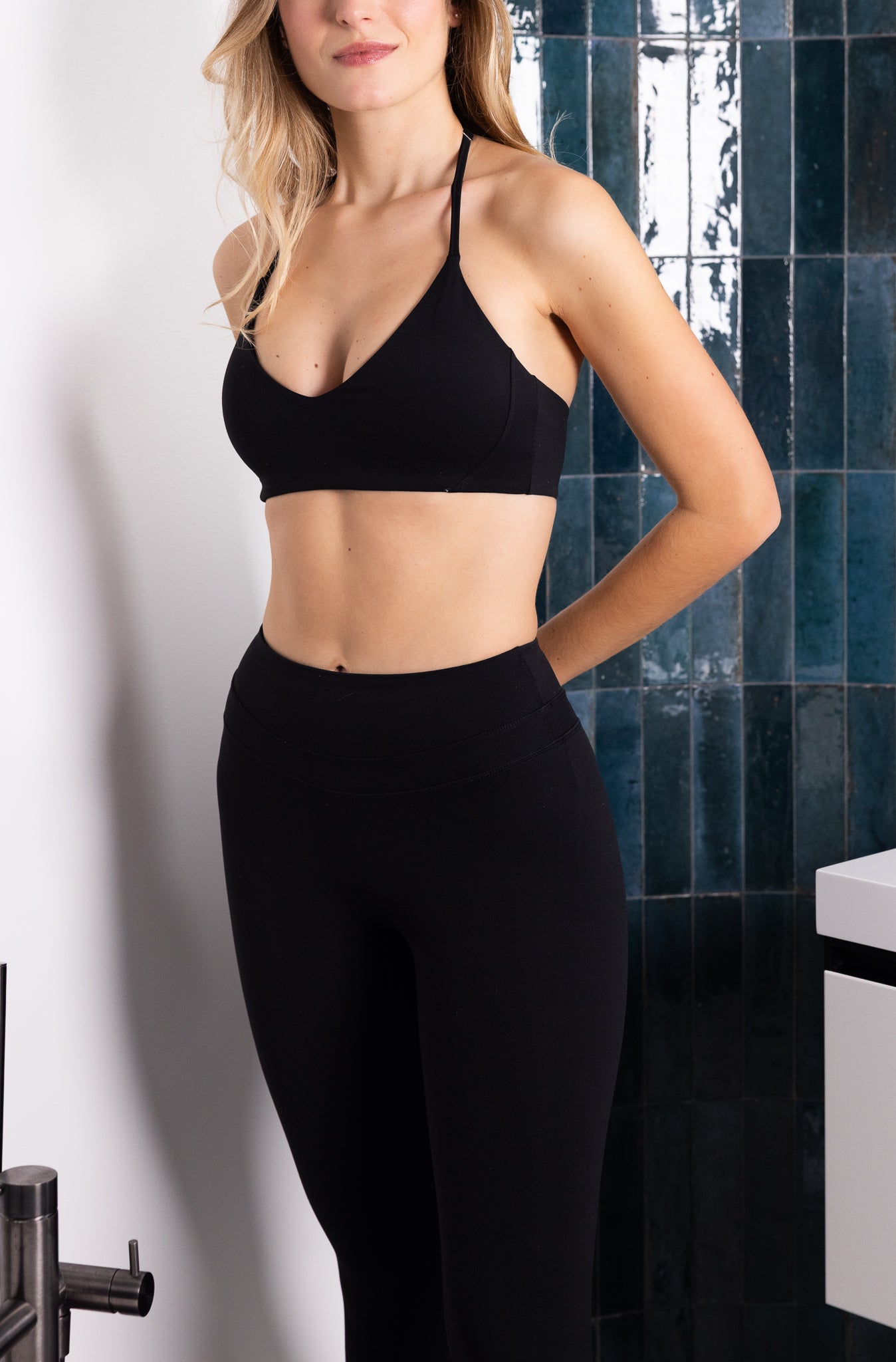 The Wellness Theories Black Legging & Plunge Bra (V-neck) Set combines feminine lines, lasting comfort, and sleek style.