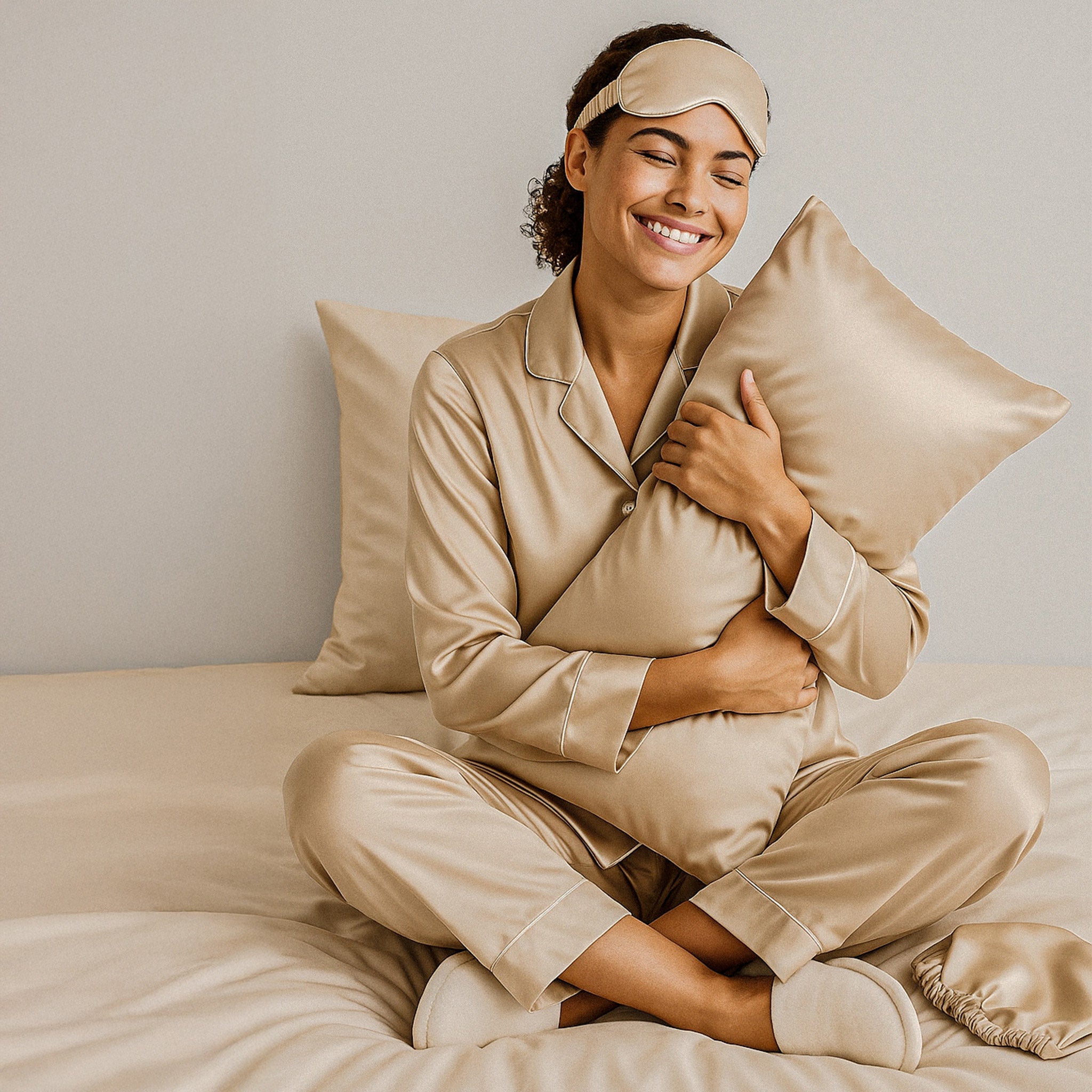 Together, these four exceptional silk pieces form a premium nighttime ritual, combining luxury, comfort, and care for soothed skin, beautiful hair, and deeply restorative sleep.