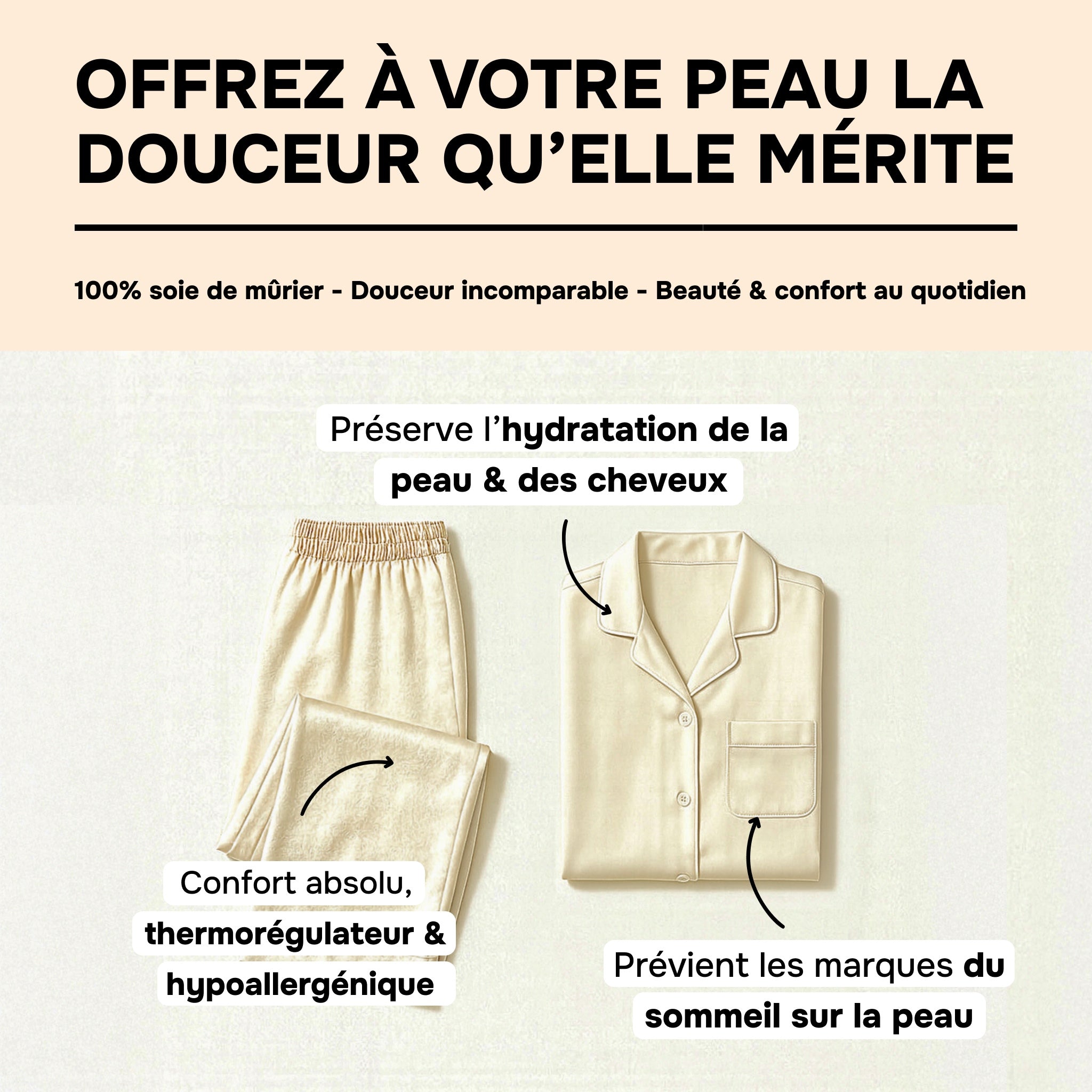 Silk pajamas: made from 100% 22 MM mulberry silk, they provide a feeling of absolute comfort and soothing lightness. Their fluid texture delicately hugs the body and promotes deep, restful sleep, while offering timeless elegance. Available sizes: XS to XL