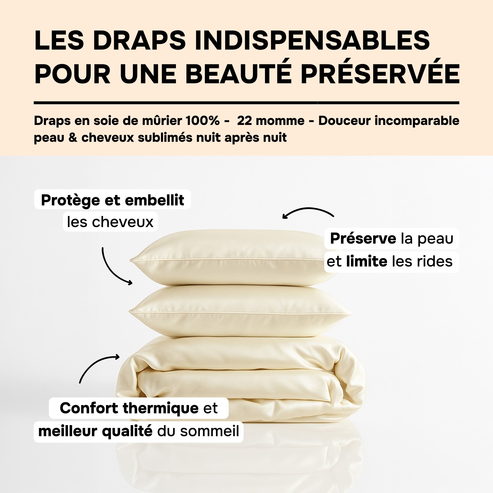 The complete silk bedding set (160x200): made from 100% 22 MM mulberry silk, it envelops the body in unparalleled softness and ensures natural temperature regulation throughout the night. Hypoallergenic, breathable, and silky to the touch, it preserves the natural moisture of the skin and hair, while reducing friction and sleep marks. This set includes: 1 × Duvet cover, 1 × Flat sheets, and 2 × Pillowcases 76 × 50 cm.