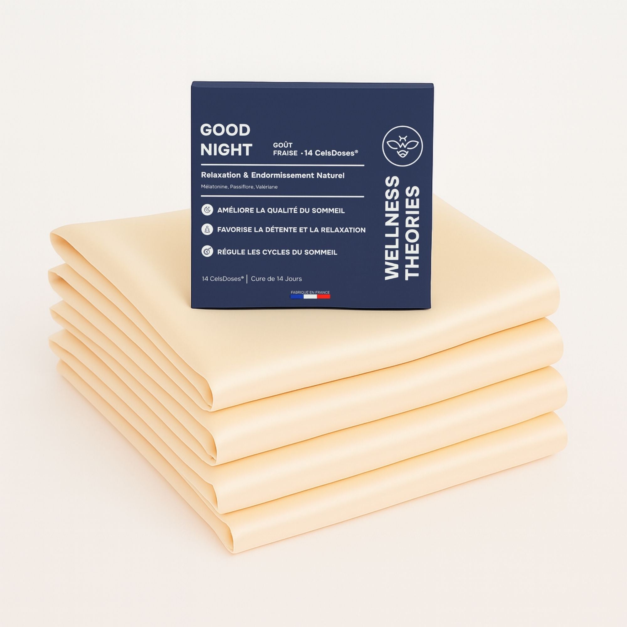 PACK 4x FUNDAS DE ALMOHADA DE SEDA 22MM CHAMPAGNE + 14 SHOTS GOOD NIGHT – Conciliación Natural del Sueño & Noche Reparadora