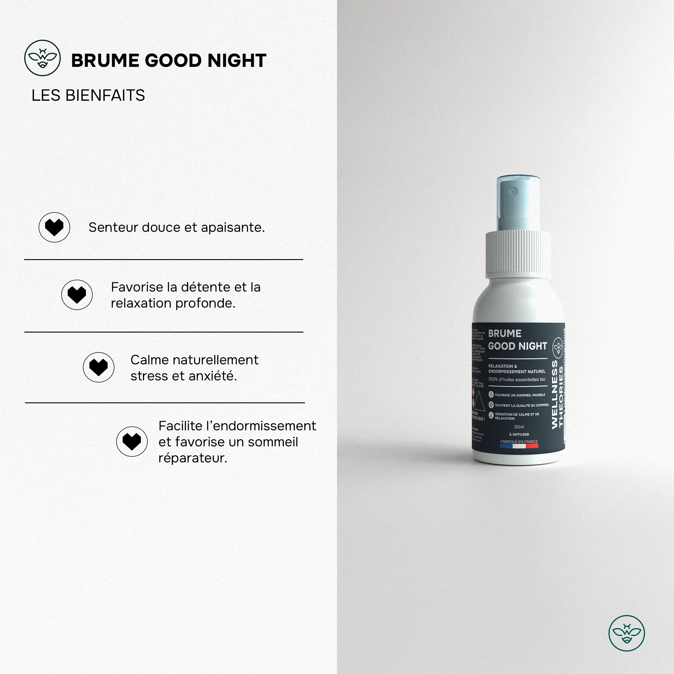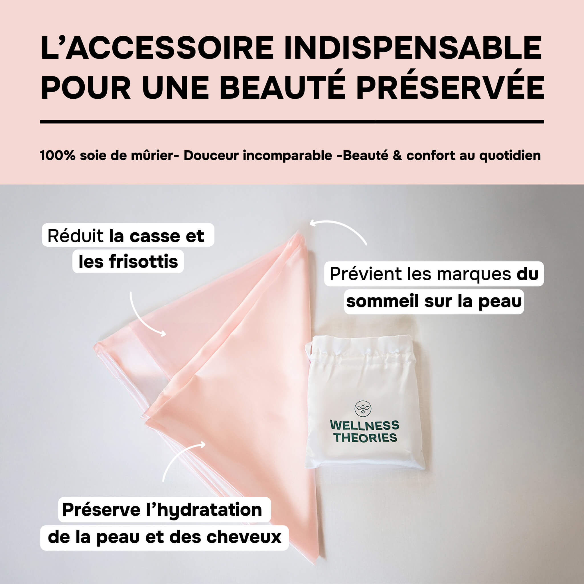 - La funda de almohada de seda actúa directamente sobre la piel y el cabello, mientras que la bruma ayuda suavemente a conciliar el sueño