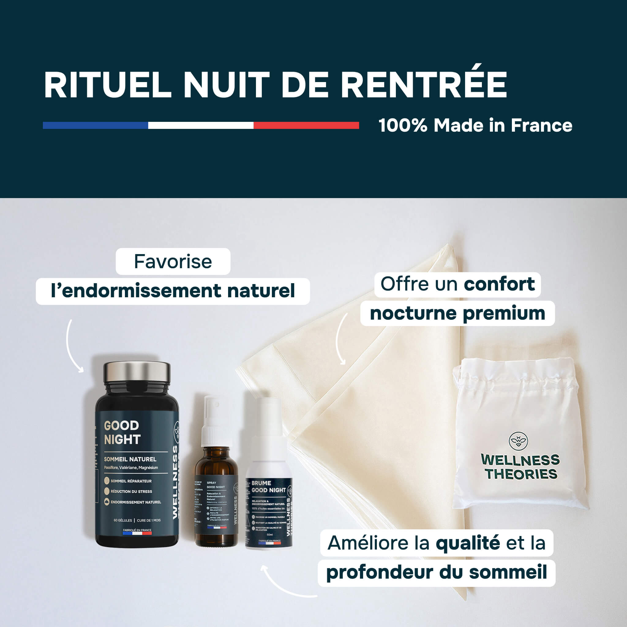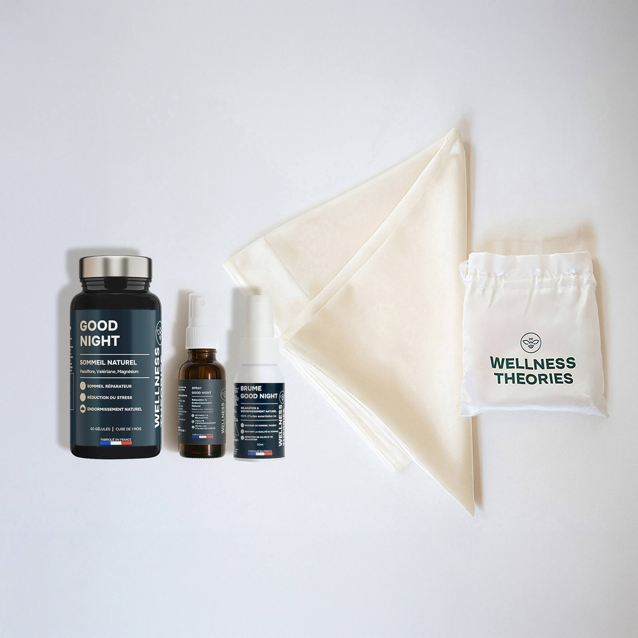 Quienes desean mejorar la calidad de su sueño: incluso sin insomnio grave, muchas personas se despiertan cansadas por la mañana. Este ritual combina cápsulas Good Night, spray, bruma relajante para la almohada y funda de almohada de seda para favorecer un sueño tranquilo y revitalizante.