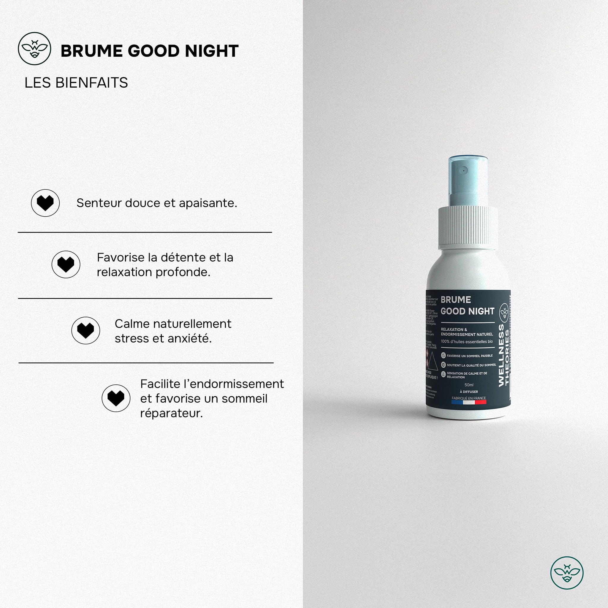 BRUMA GOOD NIGHT – Spray Bio con Aceites Esenciales Naturales para Relajación, Sueño Profundo & Noche Reparadora – Lavandín, Manzanilla, Ylang-Ylang & Naranja Dulce – 50 ml – Made in France