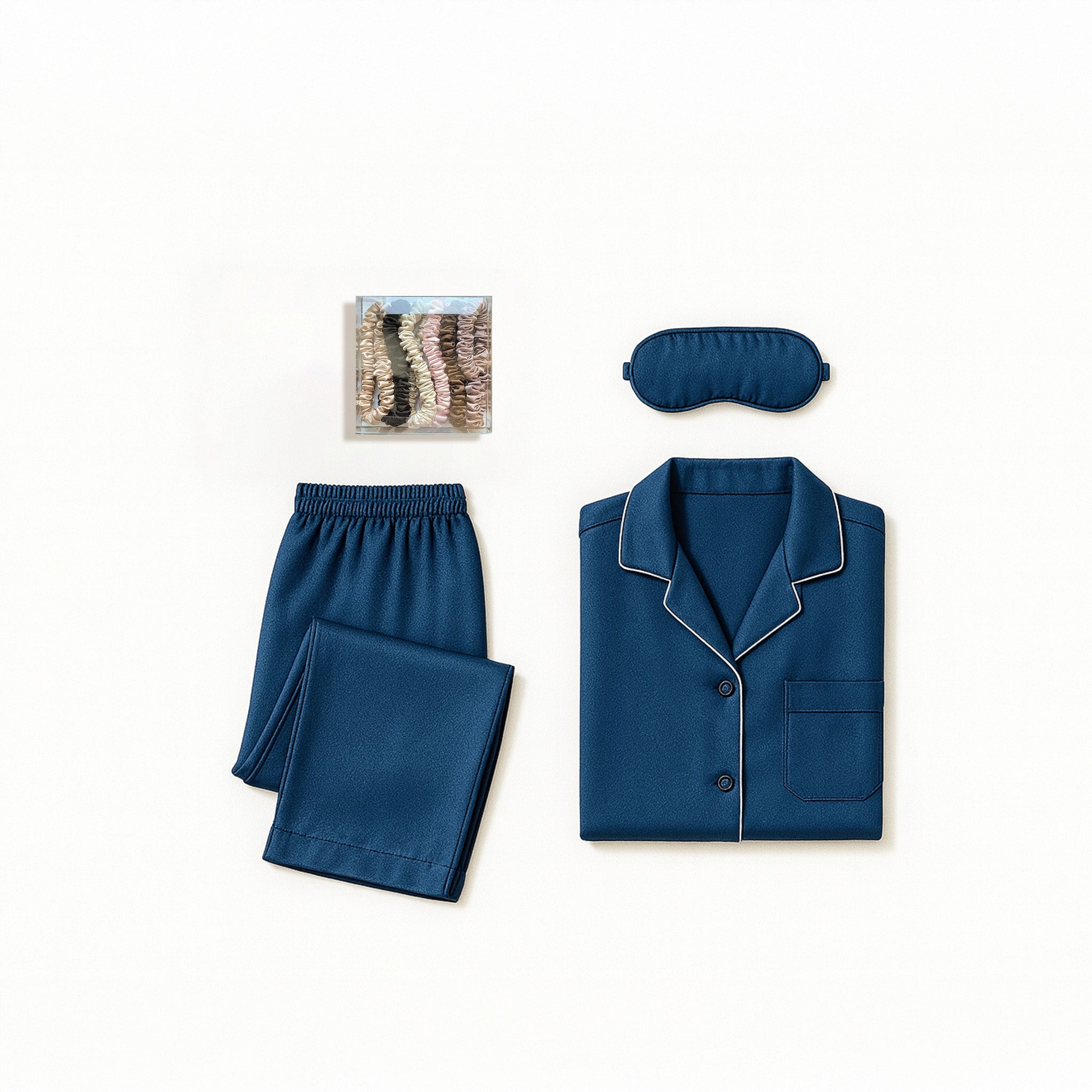 PACK SUEÑO SEDA AZUL - PIJAMA, ANTIFAZ DE NOCHE Y CAJA DE 6 COLETEROS DE SEDA - CONFORT, BELLEZA Y SUEÑO REPARADOR