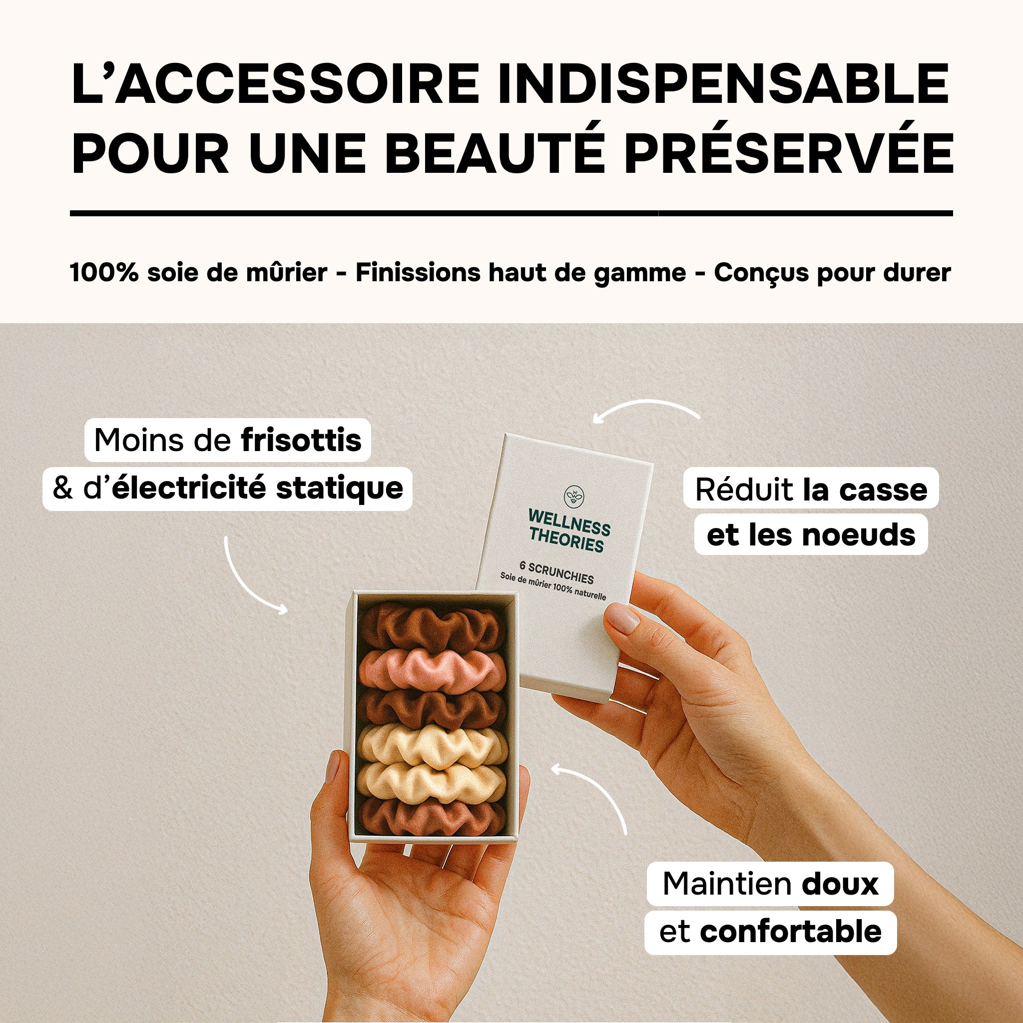 Caja de 6 scrunchies de seda de morera 22 mm – 100% natural – Reduce el encrespamiento, preserva la hidratación – Elegancia & confort diario