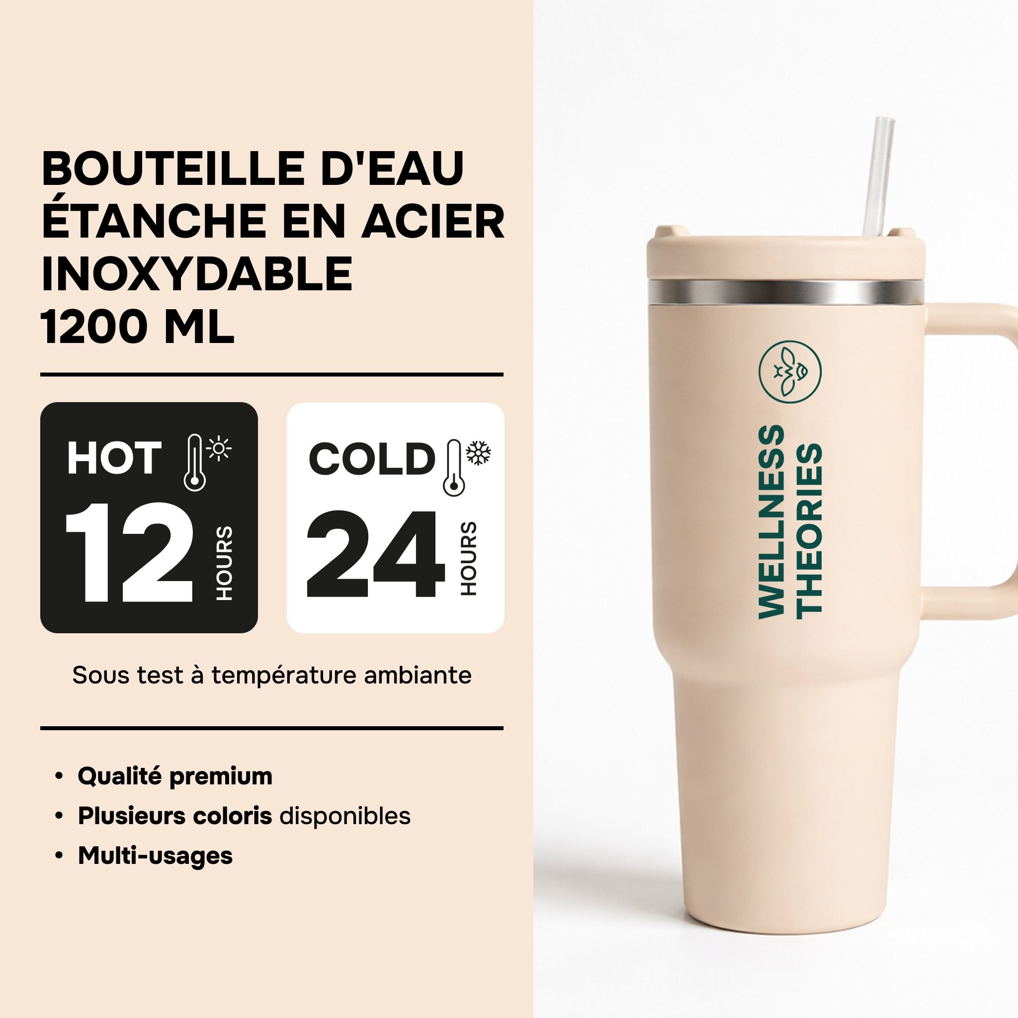 Hidrátate con estilo gracias a la botella isotérmica Wellness Theories, diseñada para mantener tus bebidas calientes 12 h o frías 24 h, estés donde estés.