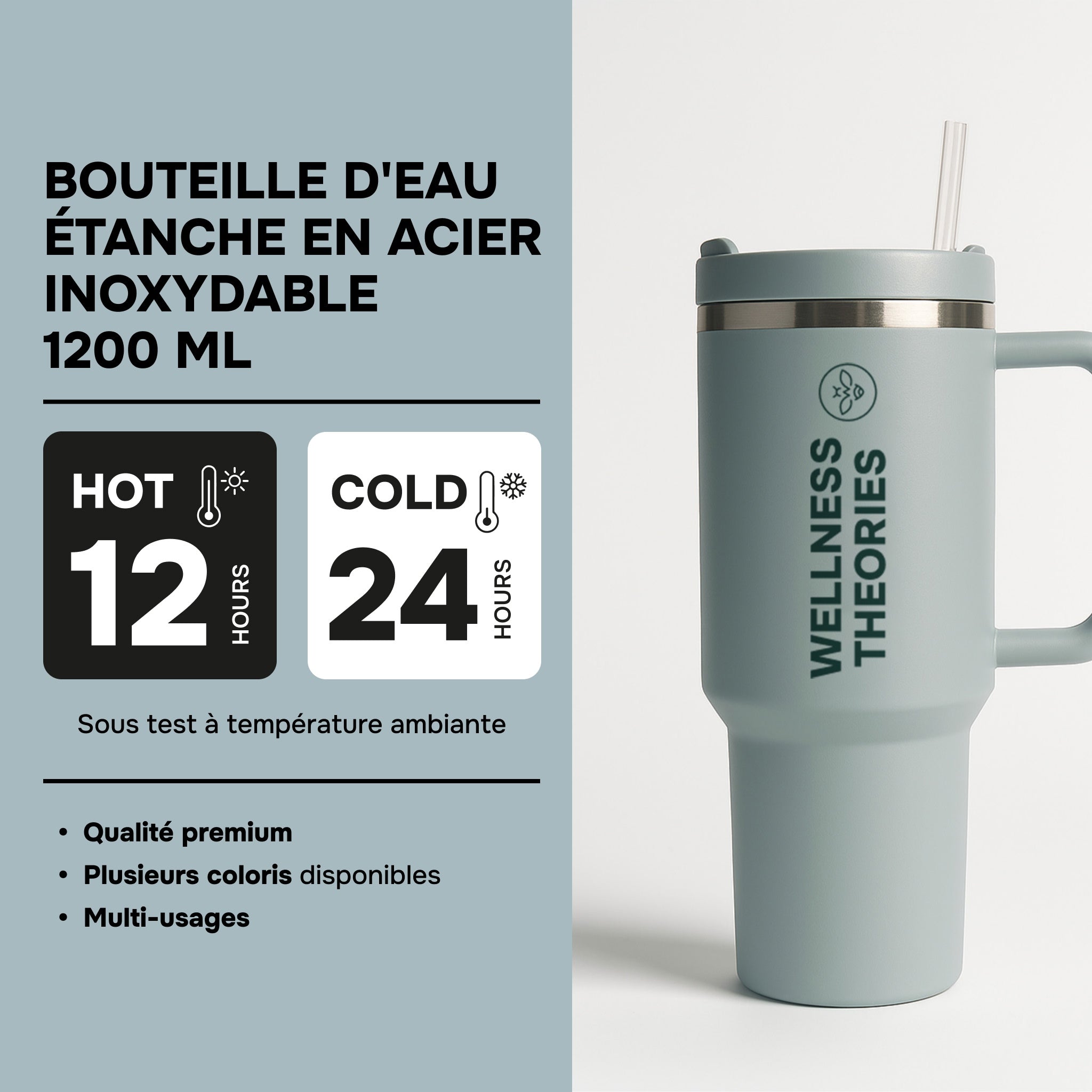 WELLNESS THEORIES - Taza isotérmica con pajita 1,2 l – Acero inoxidable - Azul