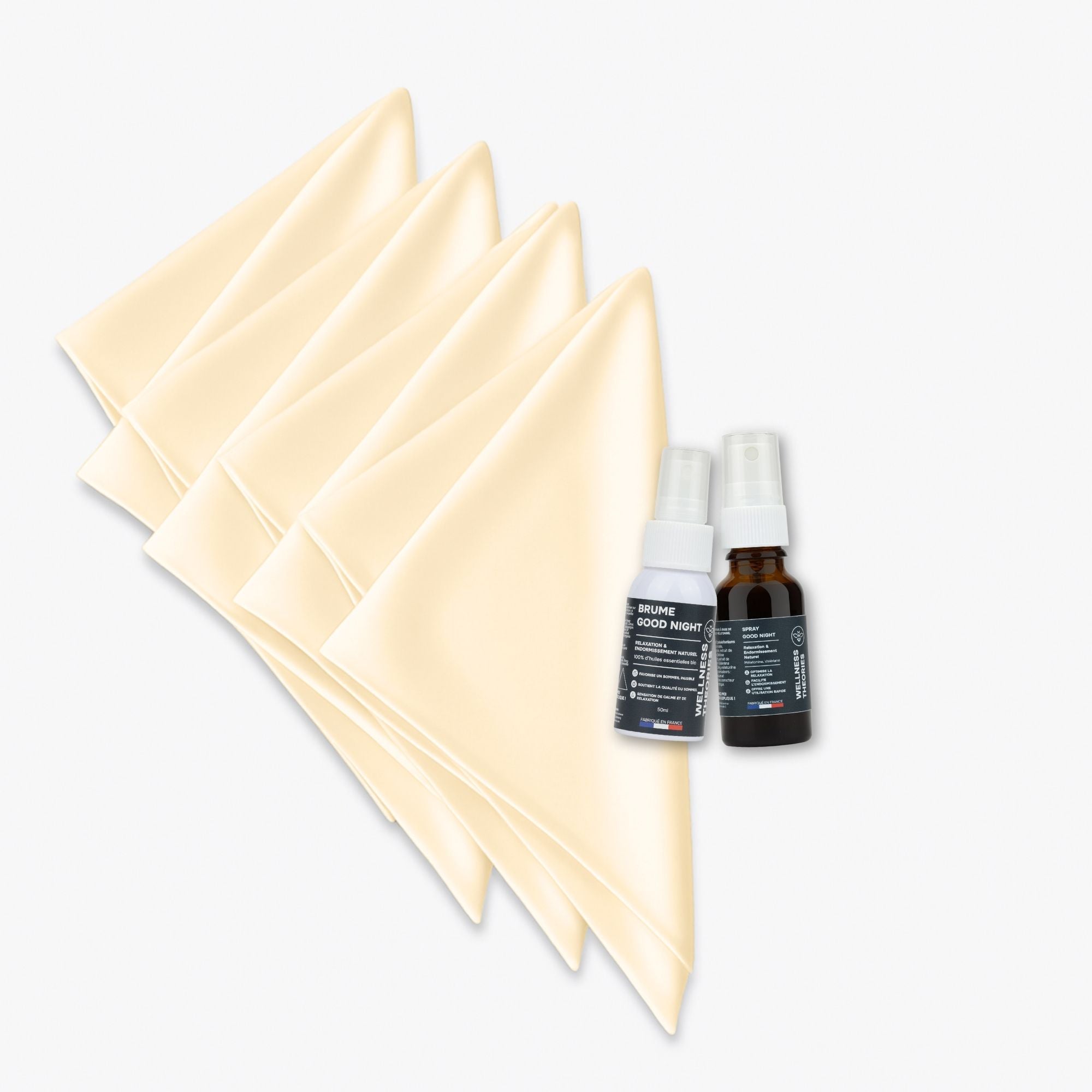 PACK 4 SÁBANAS DE CAMPAÑA DE SEDA DE 22MM + NIEBLA BUENA NOCHE + SPRAY BUCAL BUENA NOCHE - Sueño Natural, Belleza Nocturna y Sueño Reparador - Aceites Esenciales Ecológicos y Melatonina - Ritual Completo para Noches Tranquilas