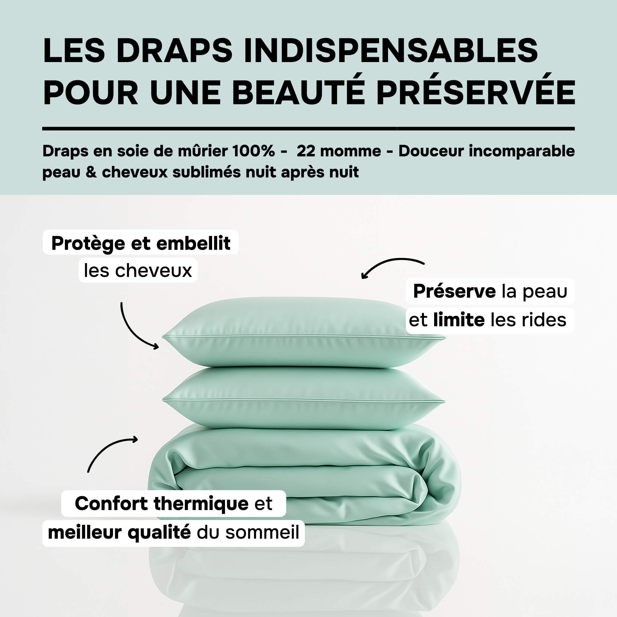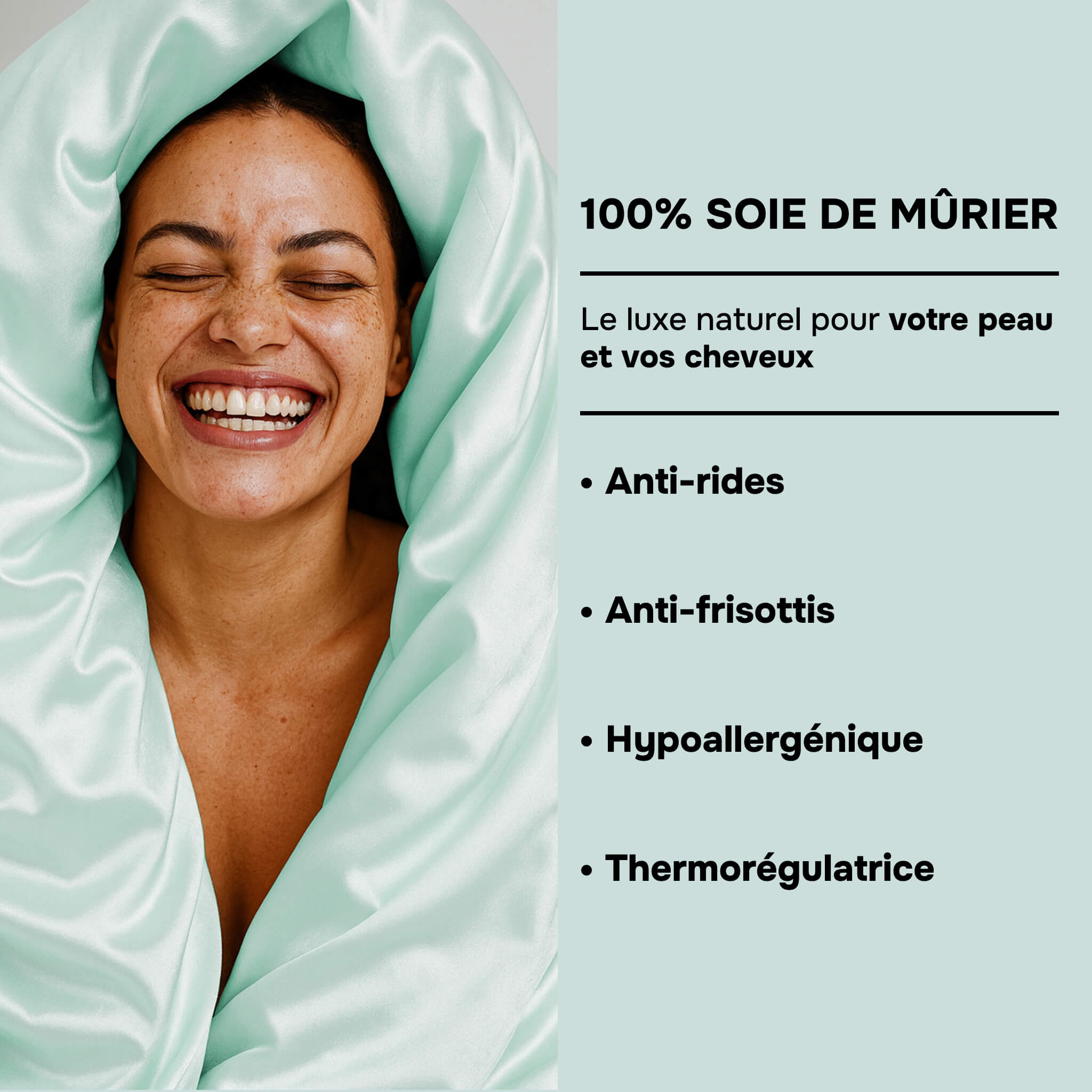Ideal para todo tipo de pieles y cabellos, la ropa de cama de seda ayuda a preservar la hidratación, a reducir la fricción responsable del encrespamiento, de las marcas de sueño y de la rotura capilar, respetando al mismo tiempo el equilibrio cutáneo.