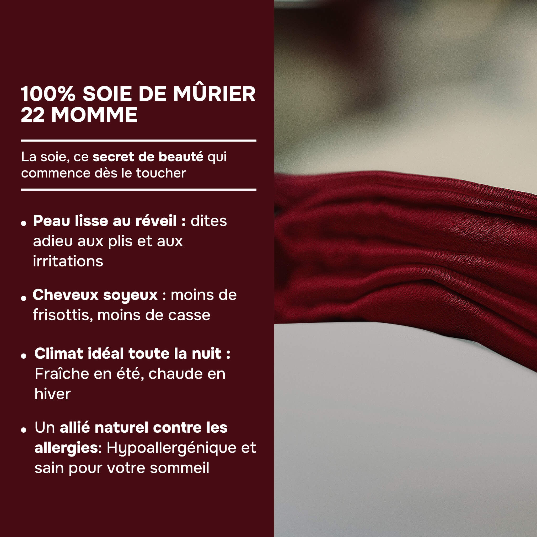Ideale per tutti i tipi di pelle e di capelli, la biancheria da letto in seta aiuta a preservare l’idratazione, a limitare gli sfregamenti responsabili dell’effetto crespo, dei segni del sonno e della rottura dei capelli, rispettando al contempo l’equilibrio cutaneo