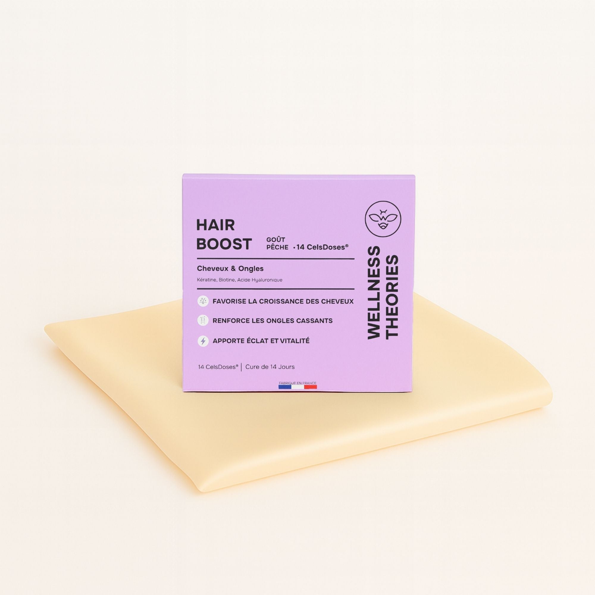 Federa in seta champagne da 22 mm + confezione da 14 shottini HAIR BOOST - Crescita, forza e vitalità dei capelli - Cheratina, biotina, zinco e vitamine - Cura completa dei capelli giorno e notte - Dosaggi bevibili - Made in France