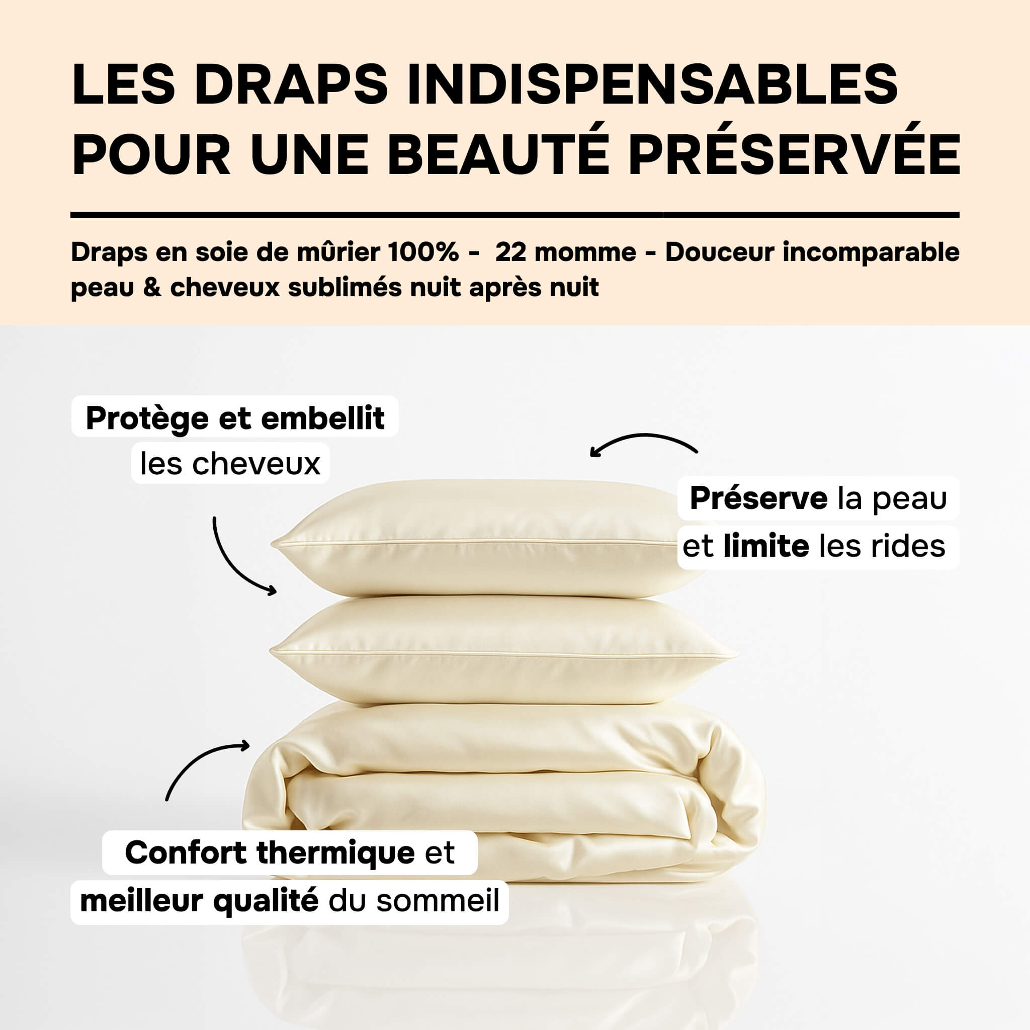 Geschikt voor alle huid- en haartypes: het zijden beddengoed helpt de hydratatie te behouden, wrijving te verminderen die verantwoordelijk is voor pluis, slaapvouwen en haarbreuk, en respecteert tegelijk de huidbalans.