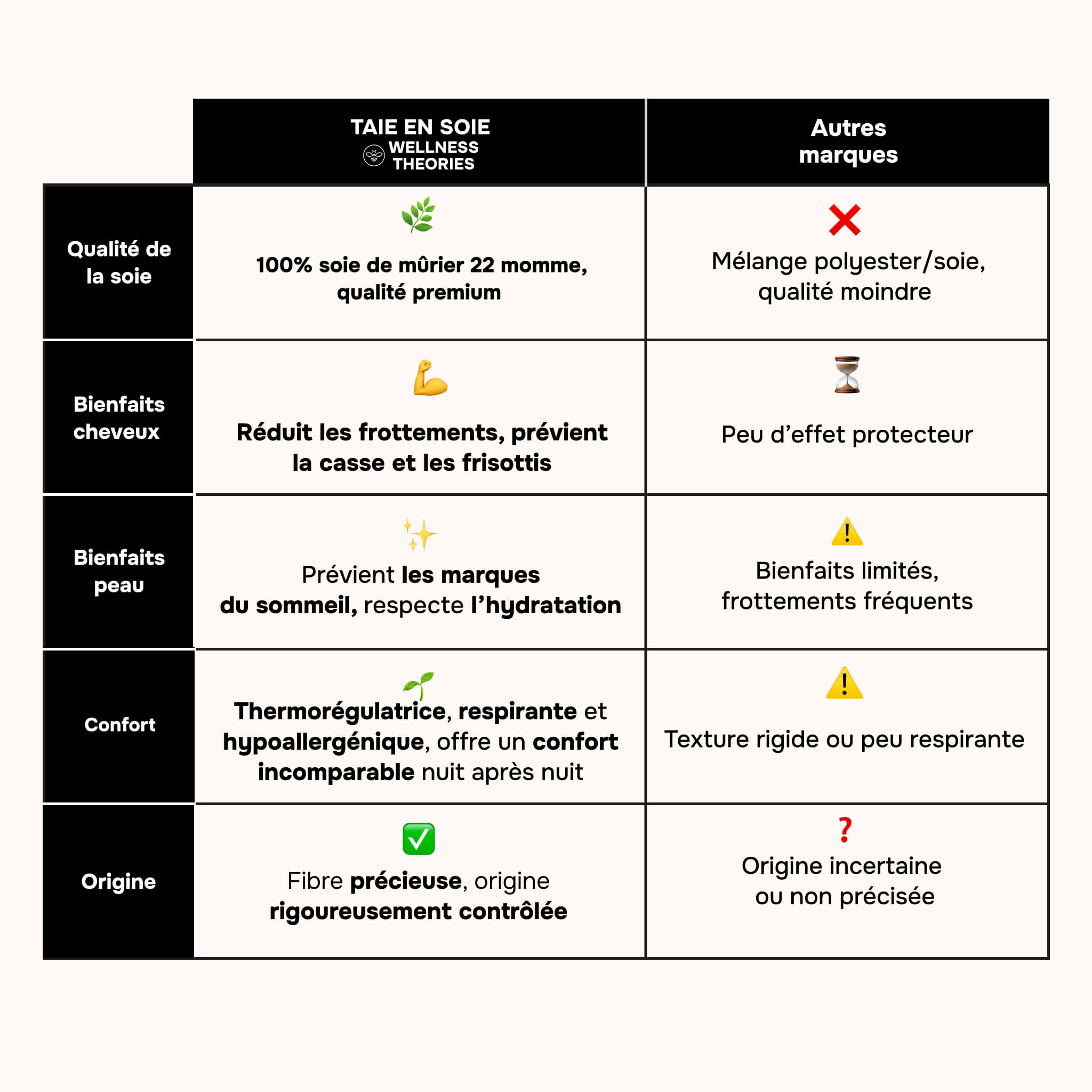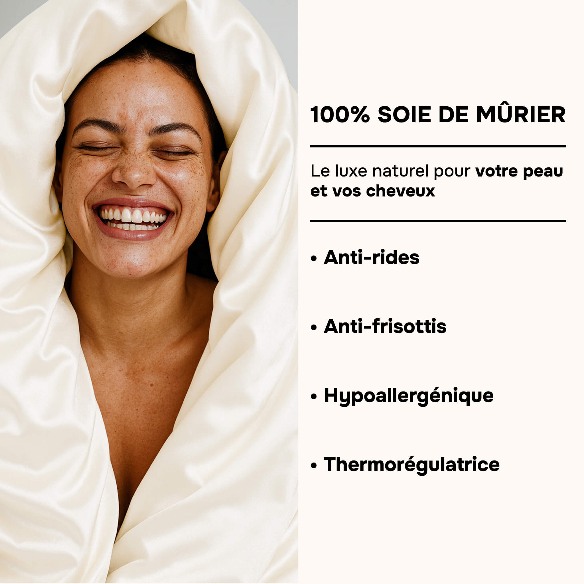 Geschikt voor alle huid- en haartypes: het zijden beddengoed helpt de hydratatie te behouden, wrijving te verminderen die verantwoordelijk is voor pluis, slaapvouwen en haarbreuk, en respecteert tegelijk de huidbalans.