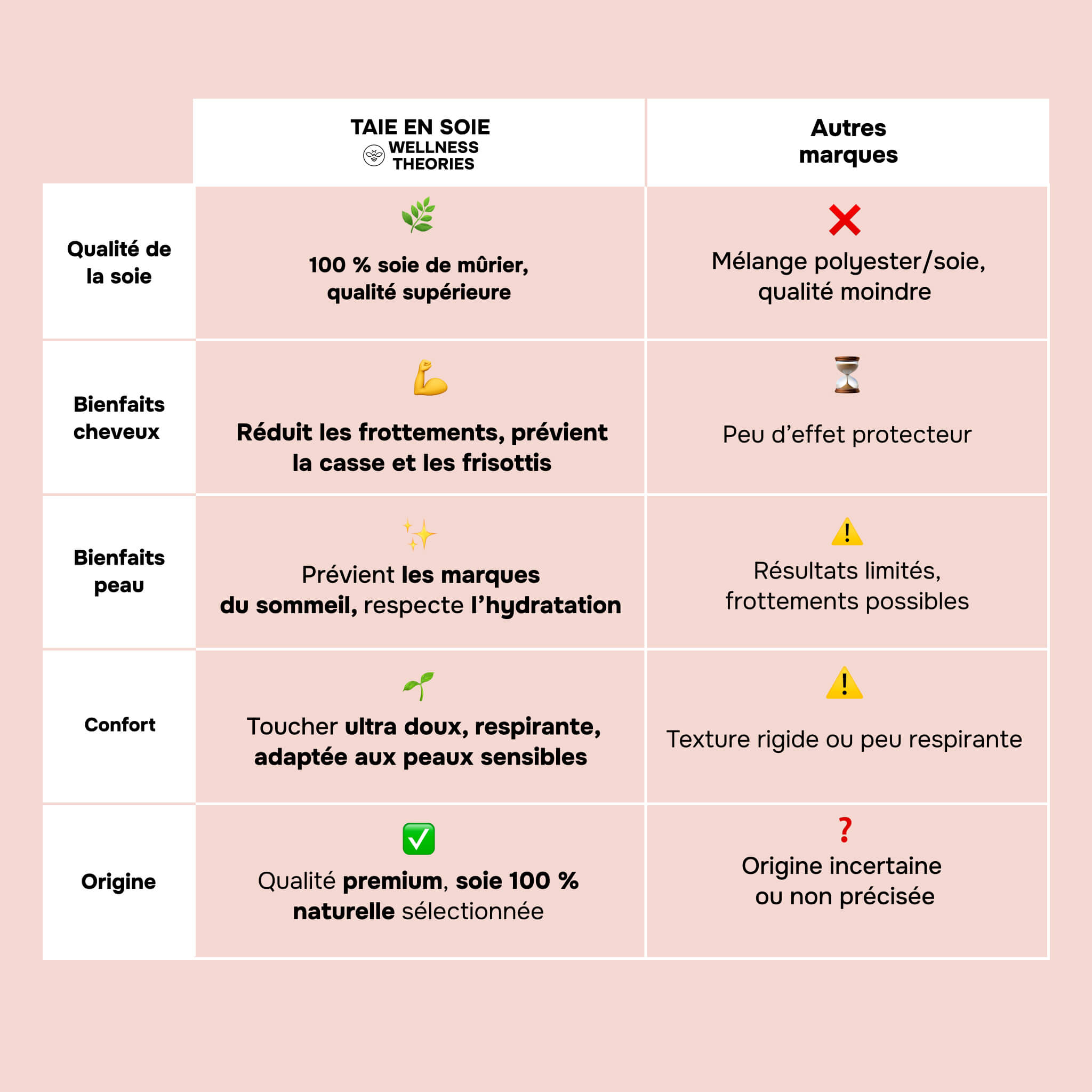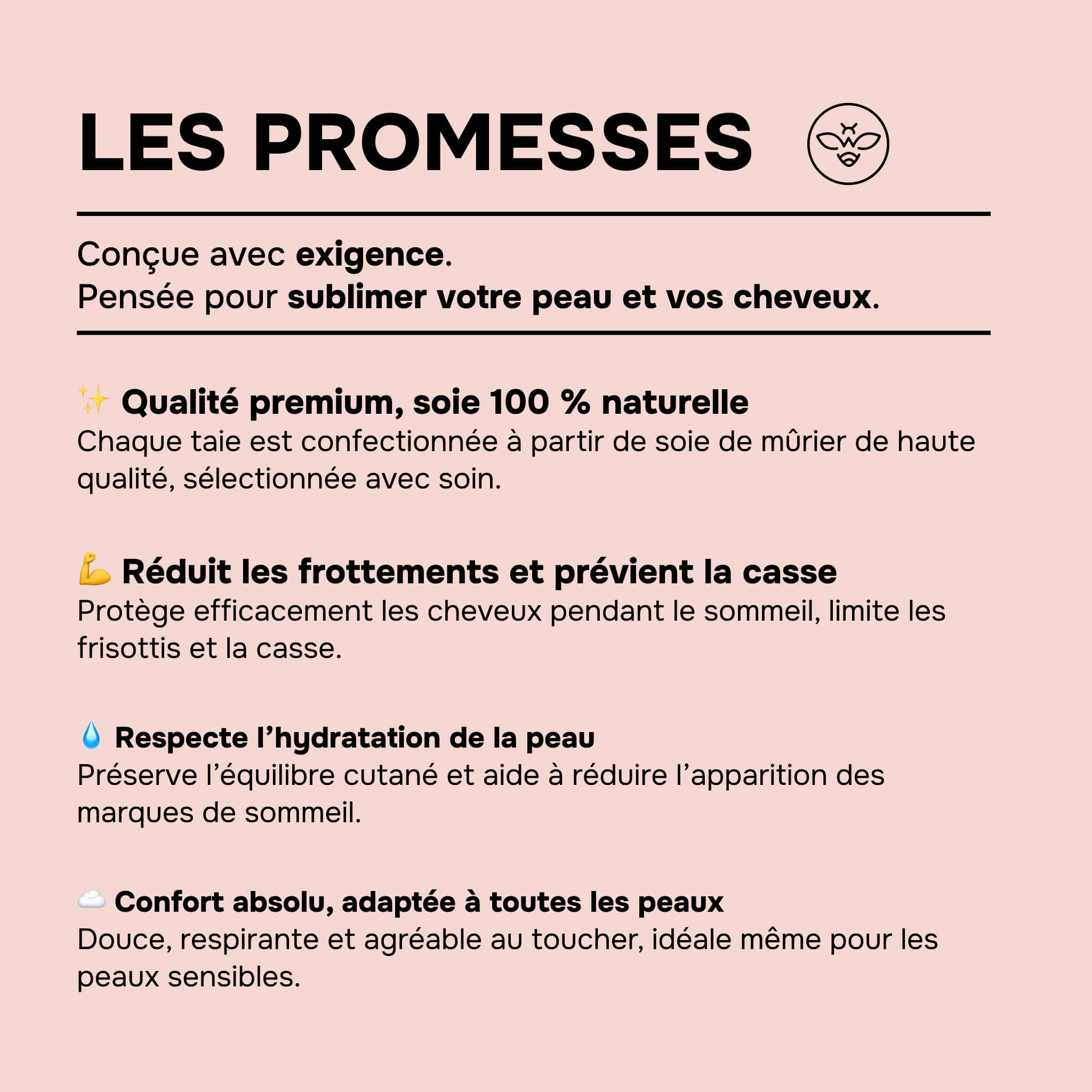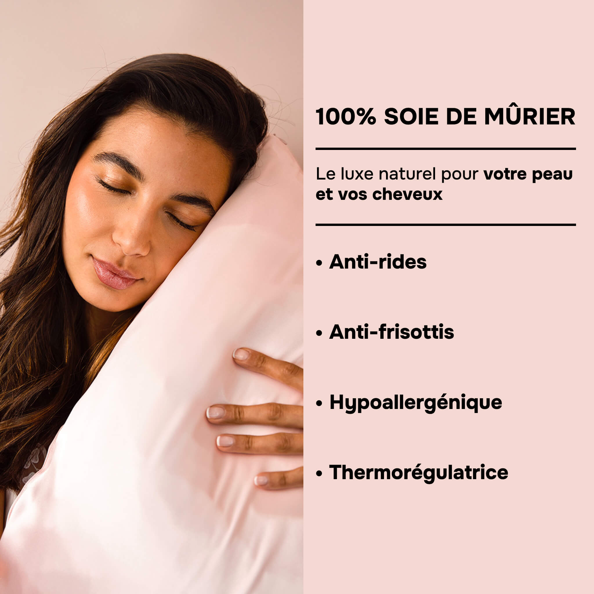 Deze luxueuze sloop is gemaakt van 100 % moerbeizijde, voelt zacht aan, is hypoallergeen en van nature temperatuurregulerend. In tegenstelling tot katoen neemt hij de ’s avonds aangebrachte verzorging niet op en respecteert hij de huidbalans. Hij helpt de huid glad te houden, het ontstaan van fijne lijntjes te beperken en het haar glanzend en soepel te laten blijven. Een onmisbaar beauty-product om toe te voegen aan de nachtelijke routine.