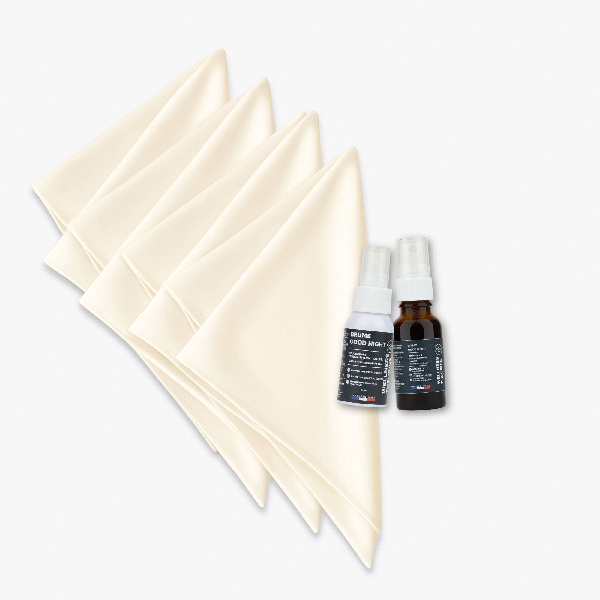 PACK 4 22MM SILK IVORY BABY SHEETS + GOOD NIGHT MIST + GOOD NIGHT BUCCAL SPRAY - Natuurlijke slaap, nacht schoonheid & herstellende slaap - Organische essentiële oliën & Melatonine - Compleet ritueel voor gekalmeerde nachten.