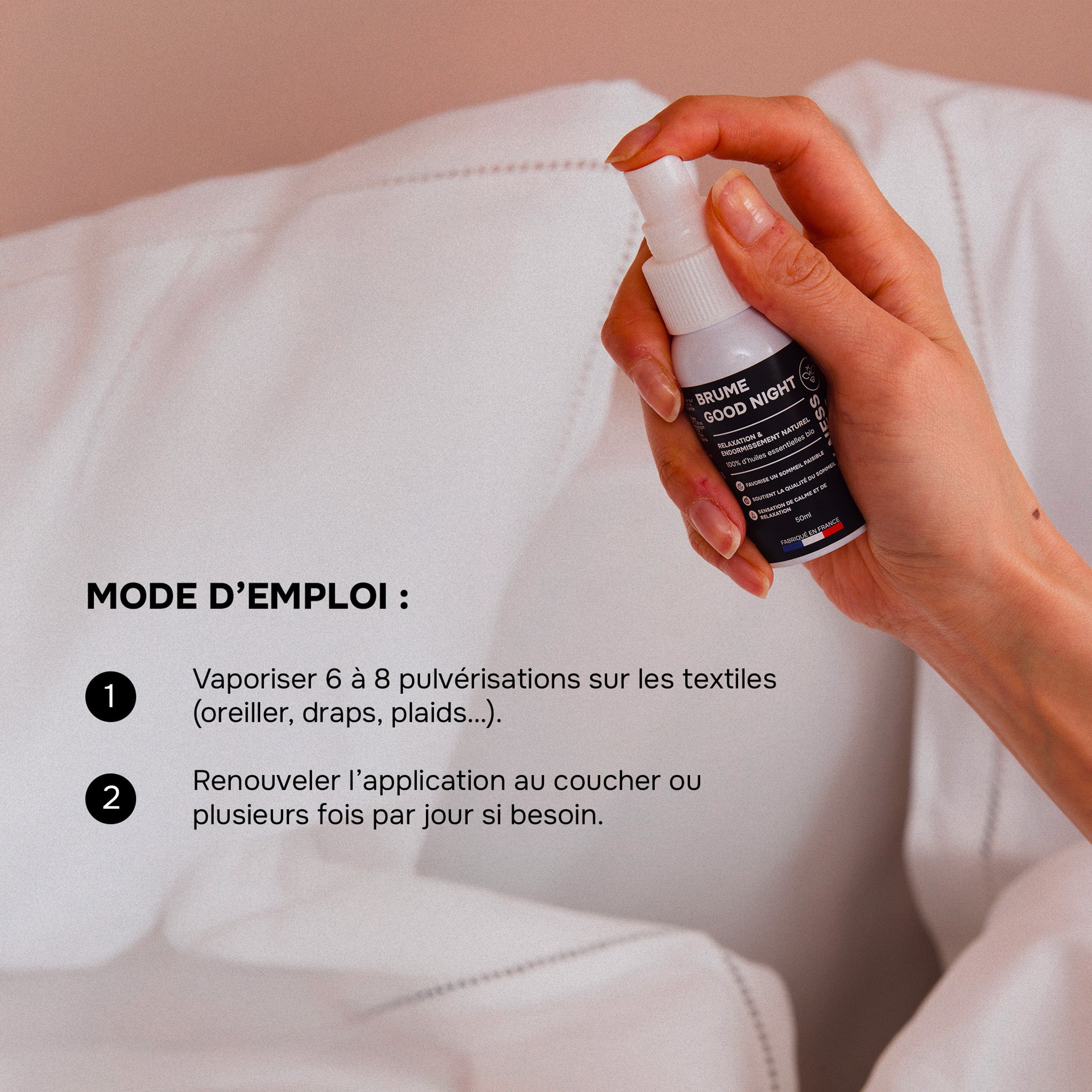 Geformuleerd met 100% biologische bloemenwaters en essentiële oliën, combineert GOOD NIGHT BRUME de kalmerende eigenschappen van lavendel, wilde kamille, zoete sinaasappel, ylang-ylang en petit grain bigarade. Een paar verstuivingen op het kussen of de lakens volstaan om een ontspannende geur te verspreiden die je uitnodigt om te ontspannen en los te laten. Ideaal om een natuurlijk avondritueel in te stellen en weer in slaap te komen, avond na avond.