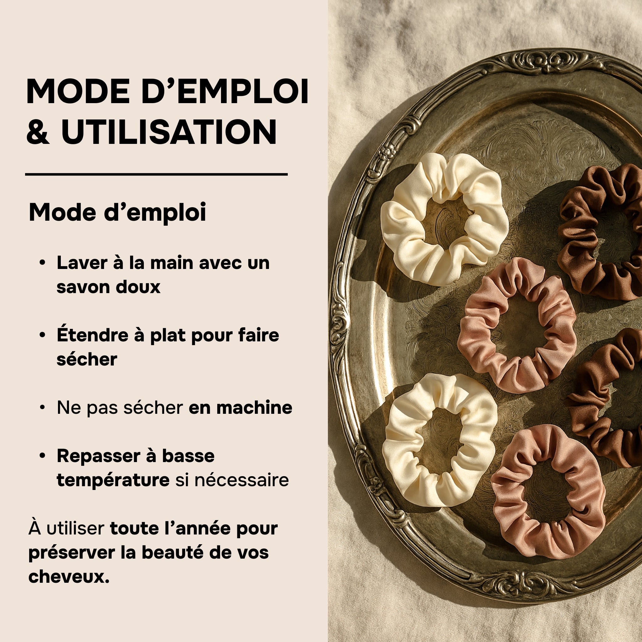 Box met 6 scrunchies van moerbeizijde 22 mm – 100% natuurlijk – Vermindert pluizigheid, behoudt hydratatie – Elegantie & dagelijks comfort