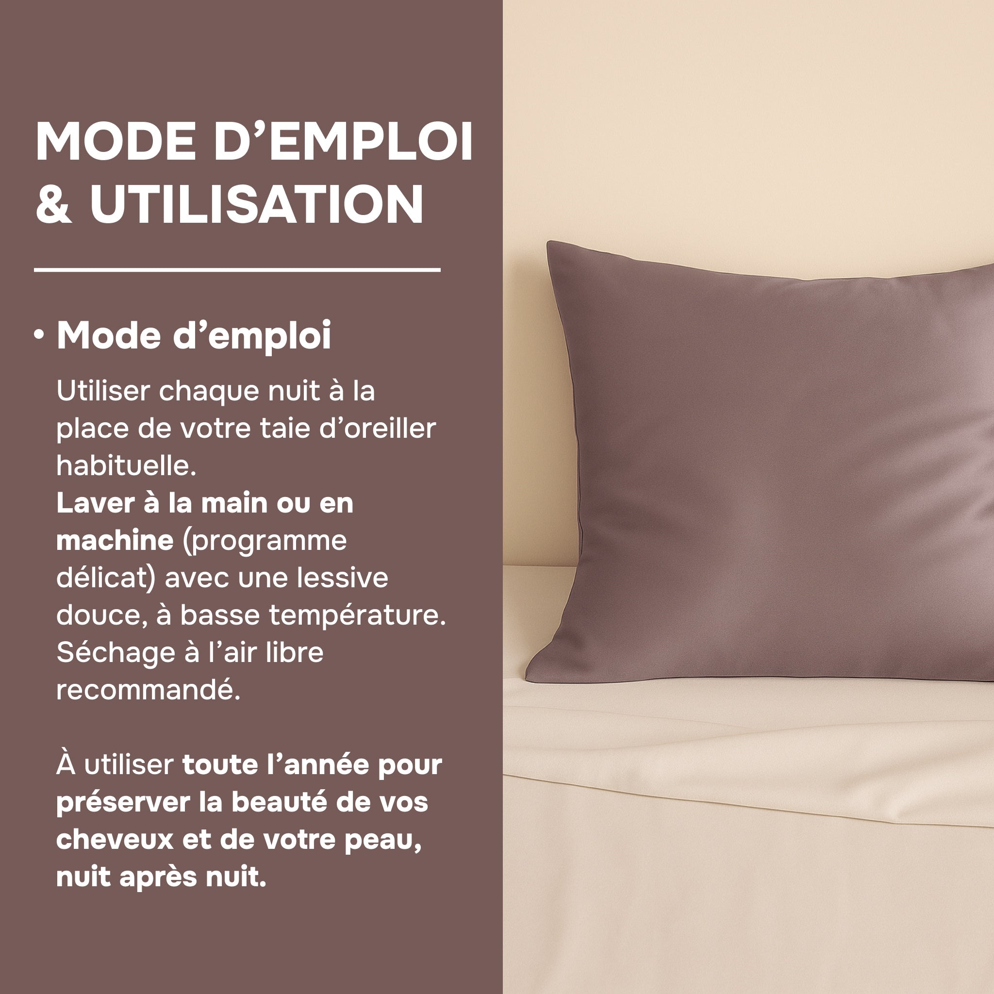 Elke nacht gebruiken als een gewone kussensloop. Om ten volle te profiteren van de voordelen voor huid en haar, wordt een regelmatige en zachte verzorging aanbevolen. Ideaal voor de gevoelige huid, het kan het hele jaar door worden gebruikt voor optimaal comfort en een natuurlijke frisheidssensatie.