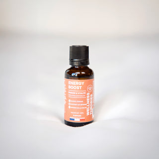 - Energy Boost – Flacon 30 ml – En diffusion, inhalation ou massage, pour stimuler la clarté mentale, favoriser la concentration et maintenir un bon niveau d’énergie au quotidien.