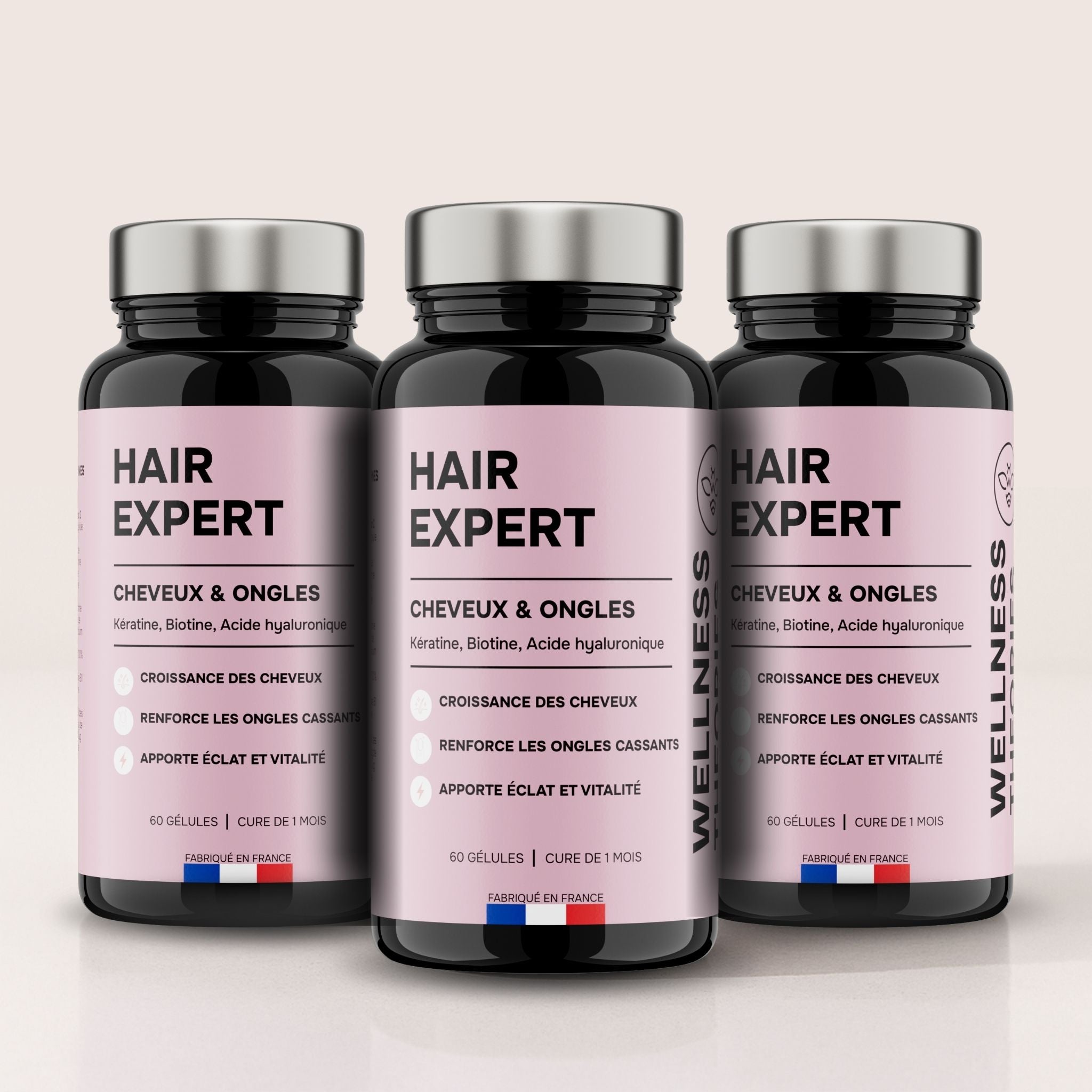 Pack x3 HAIR EXPERT – Croissance, Force & Éclat des Cheveux – Kératine, Biotine, Zinc, Acide Hyaluronique & Vitamines – Cure de 3 Mois – Made in France
