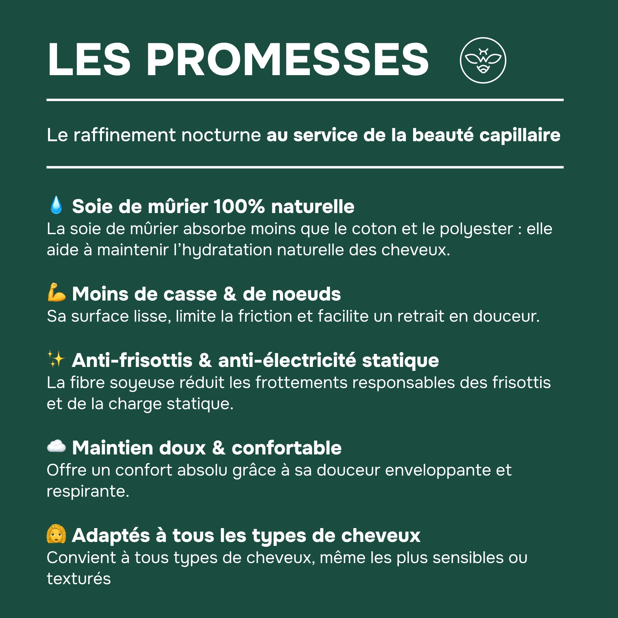 Cheveux Lisses et Hydratés : Dites adieu aux frisottis et à la casse, vos cheveux restent doux et hydratés nuit après nuit.
